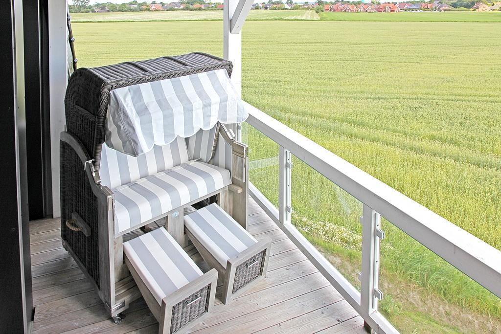Das Apartment verfügt über einen großen, überdachten Balkon mit Gartenmöbeln und einem traumhaften Blick über die weiten Felder bis zum Meer und dem Nordseedeich. Im gemütlichen Strandkorb könnt ihr auf dem Balkon den Abend ausklingen lassen und die ein- und auslaufenden Schiffe beobachten.