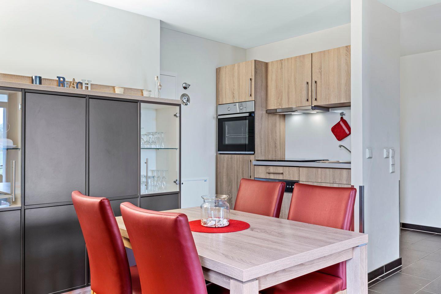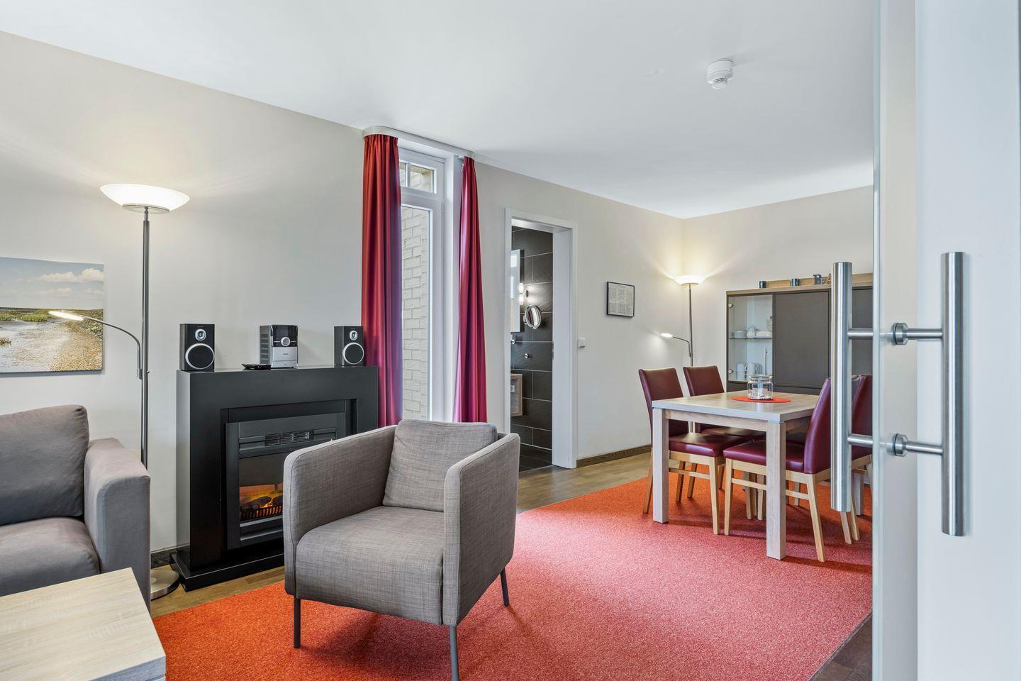 Das moderne Nichtraucher-Apartment verfügt über kostenfreies WLAN und eine voll ausgestattete offene Küche mit Geschirrspüler, Kaffeefilter- und Kaffeepad Maschine (Senseo), Toaster, Wasserkocher, Tiefkühlfach und Backofen. Im Schlafzimmer stehen euch ein Doppelbett (1,80 x 2,00 m) und Flatscreen-TV, im Wohnbereich ein weiterer Flatscreen-TV, eine HiFi-Anlage, Telefon und ein Elektrokamin zur Verfügung. Zur hochwertigen Ausstattung der Ferienwohnung gehören außerdem ein Minisafe und Gesellschaftsspiele. Ein Kinderbett kann gegen Entgelt aufgestellt werden und auf Wunsch könnt ihr einen Hochstuhl hinzubuchen.