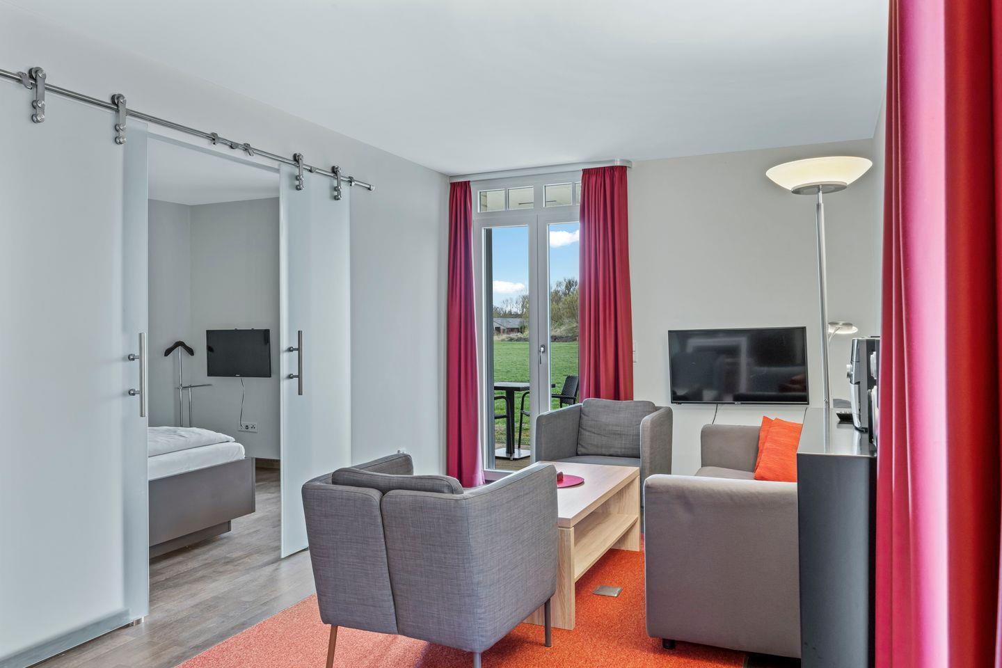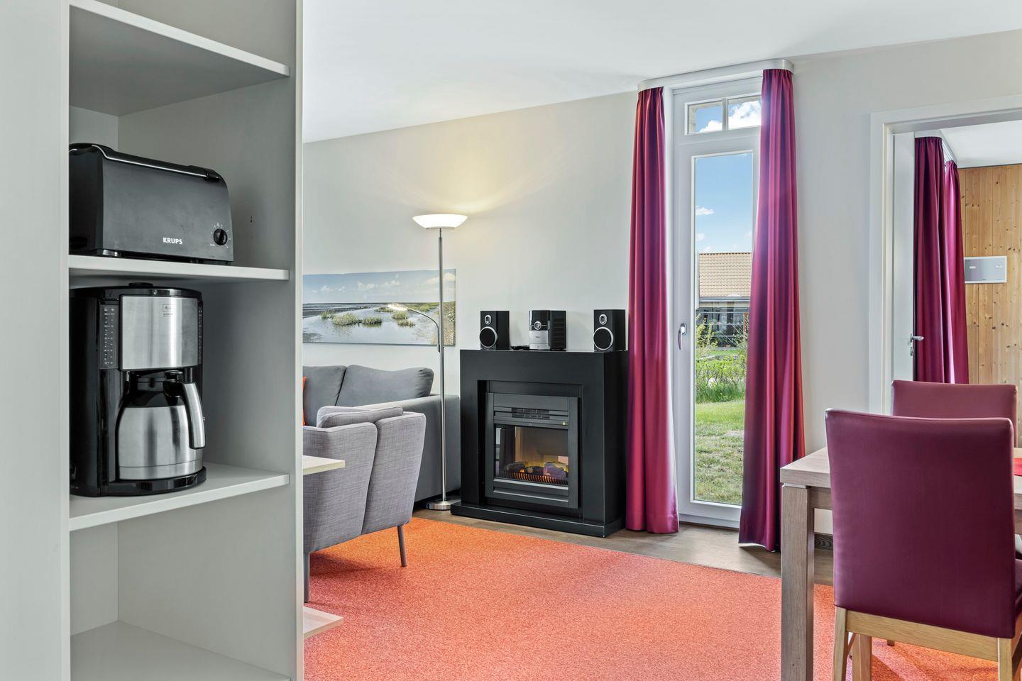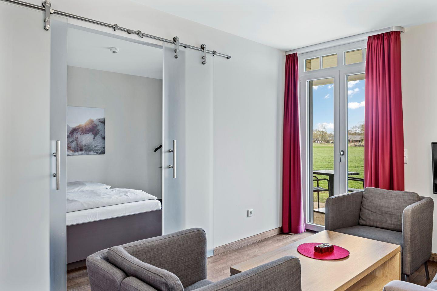 Die 66 m² große 2-Zimmer Ferienwohnung ist für bis zu 2 Personen geeignet. Besonders hervorzuheben ist die Sauna des Apartments und die wunderbar gelegene Terrasse mit Strandkorb und Zugang zu den Grünflächen.