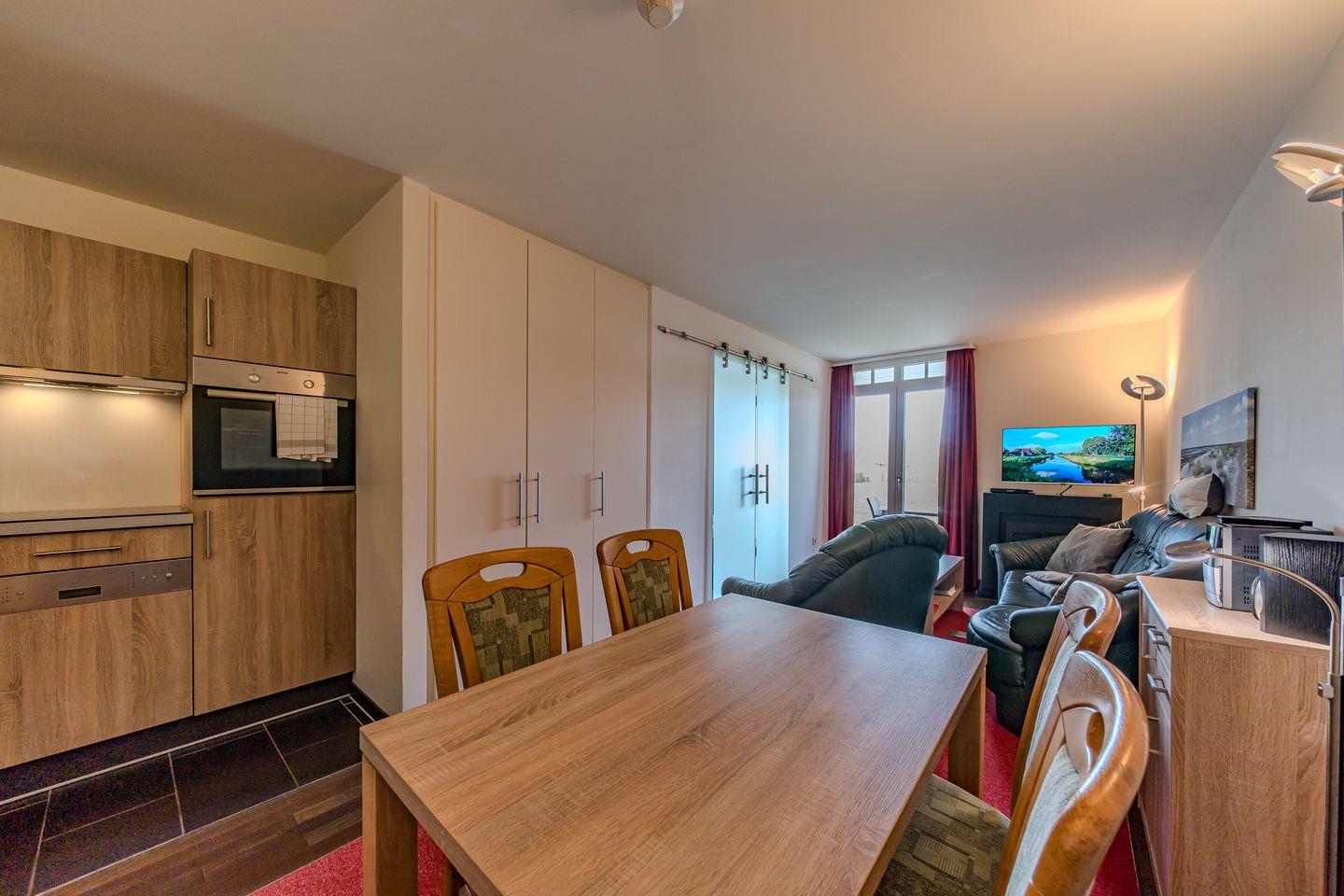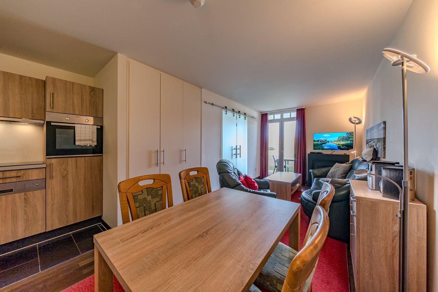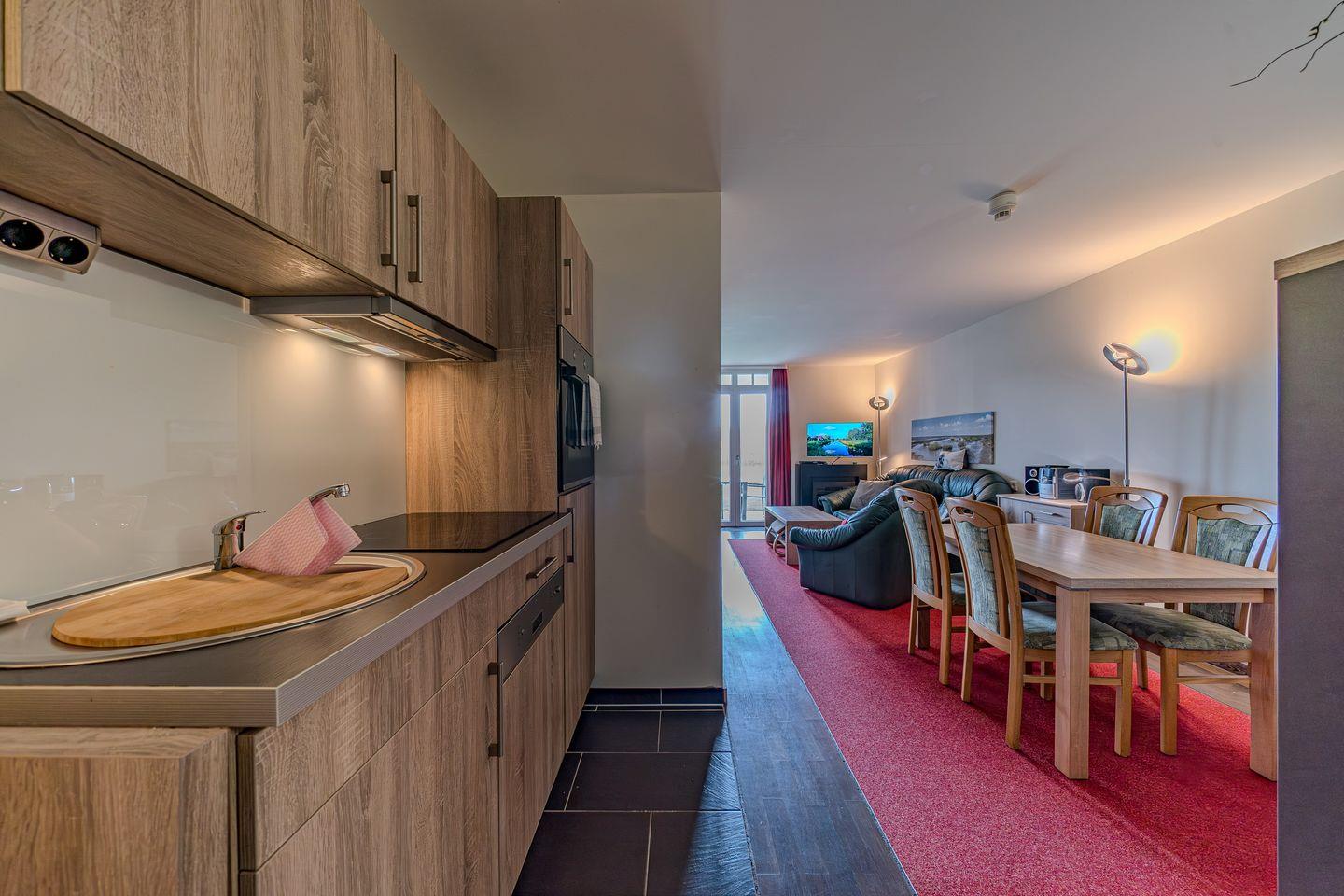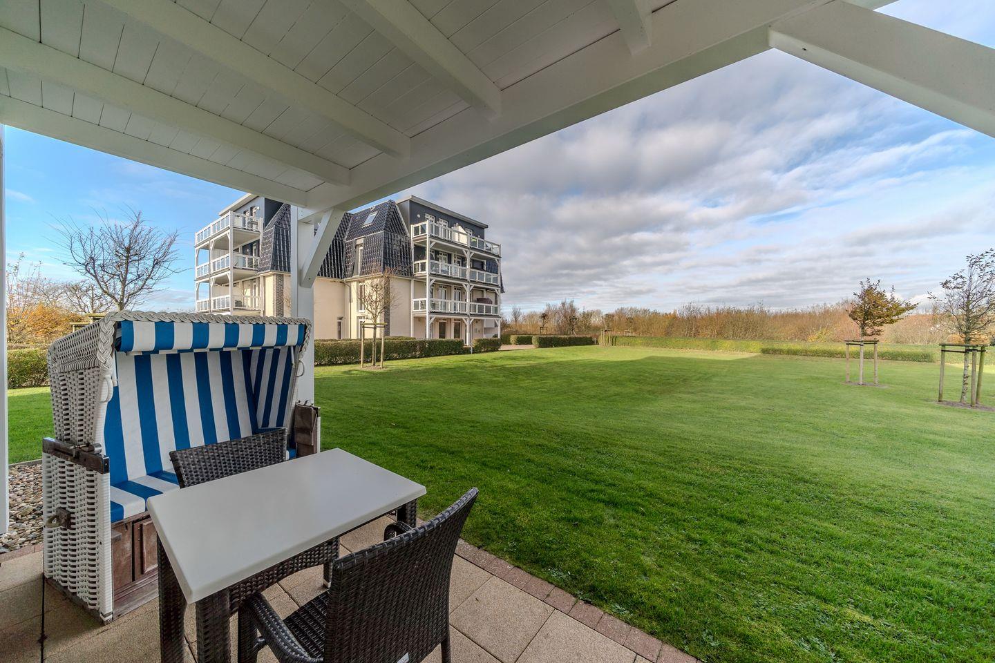 Die 70 m² große 3-Zimmer Ferienwohnung ist für bis zu 4 Personen geeignet. Besonders hervorzuheben ist die Sauna des Apartments und die Terrasse mit Strandkorb und direktem Zugang zum Garten und den Grünflächen.
