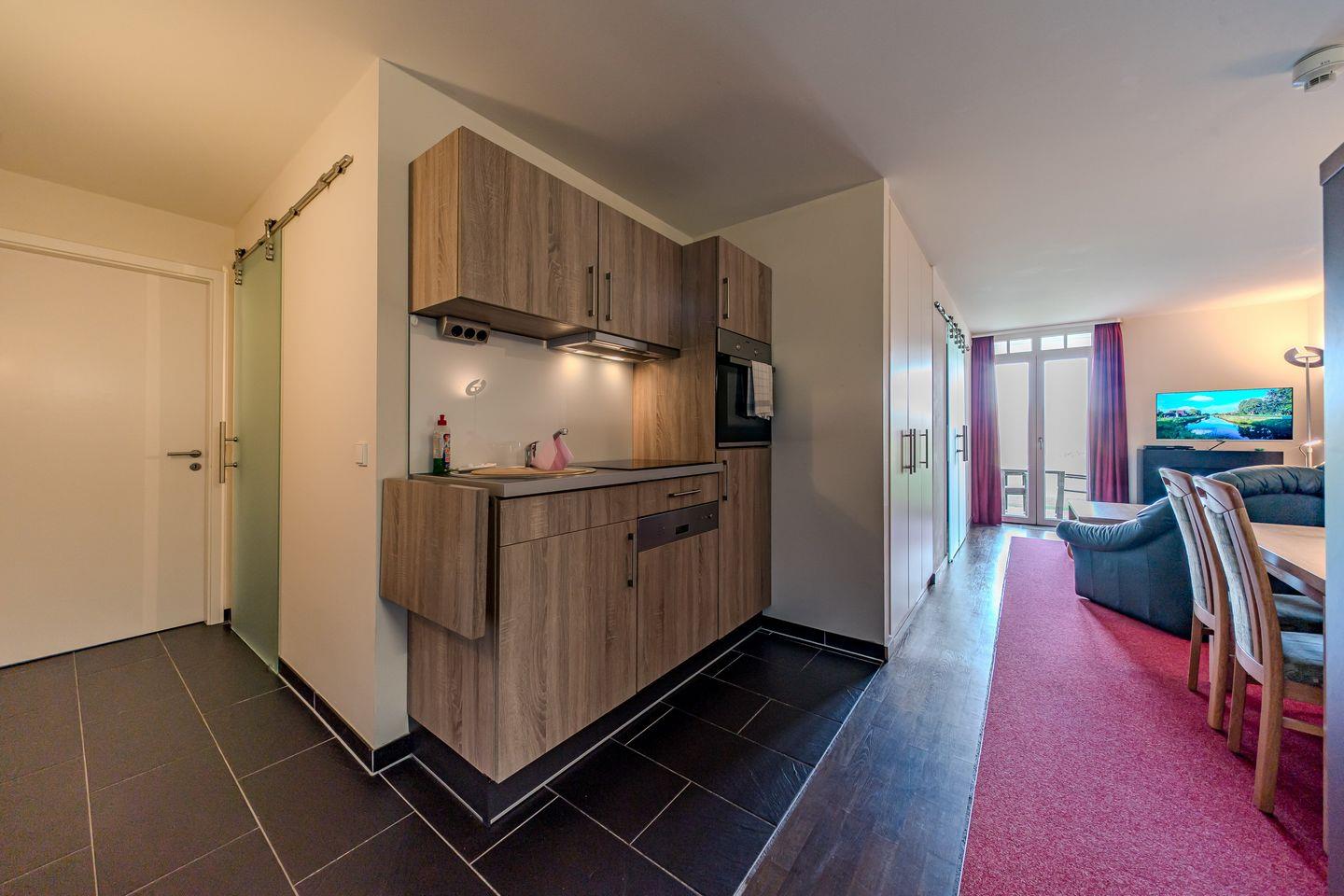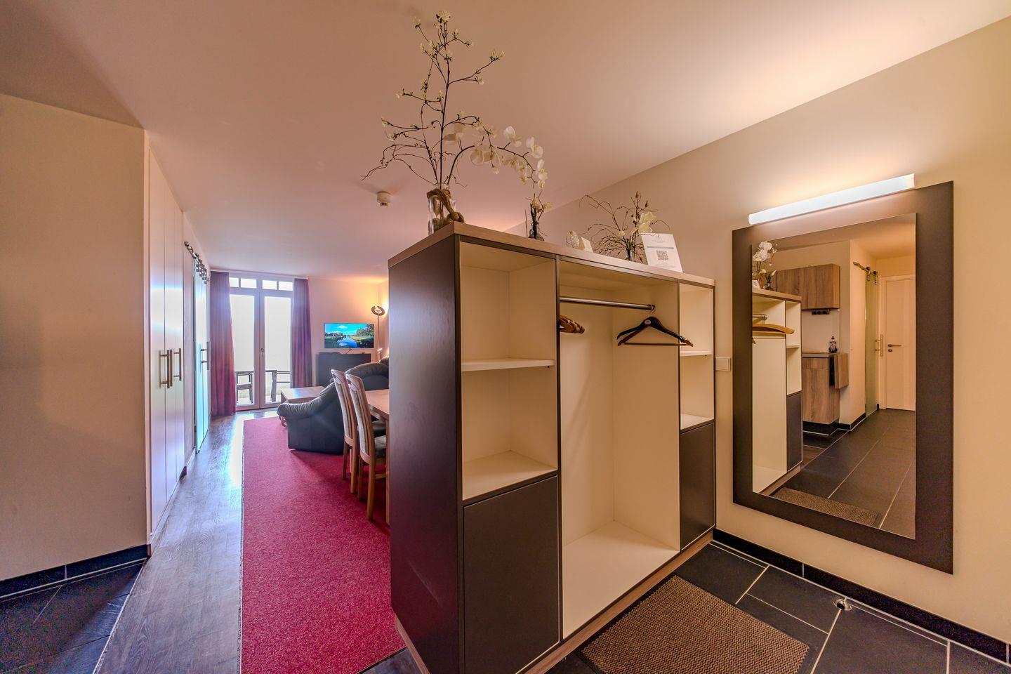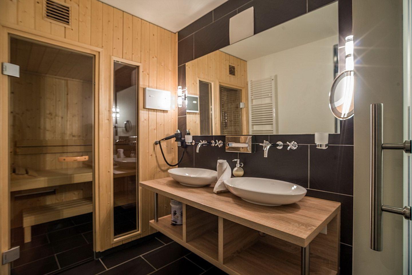 Im komfortablen Badezimmer mit begehbarer Dusche, Föhn und Kosmetikspiegel befindet sich eine eigene Sauna zur vollkommenen Entspannung in privater Atmosphäre. Ideal für Familien oder den längeren Aufenthalt: das Apartment verfügt über eine eigene Waschmaschine im separaten WC. Die schöne Terrasse mit Gartenmöbeln und eigenem Strandkorb macht das Urlaubsdomizil perfekt.