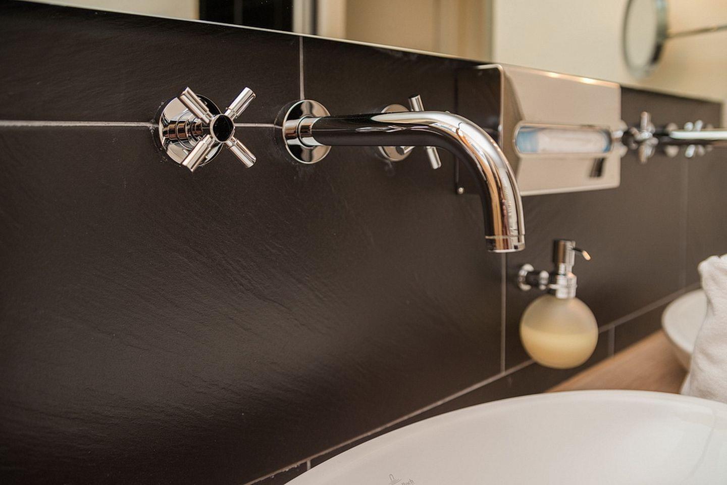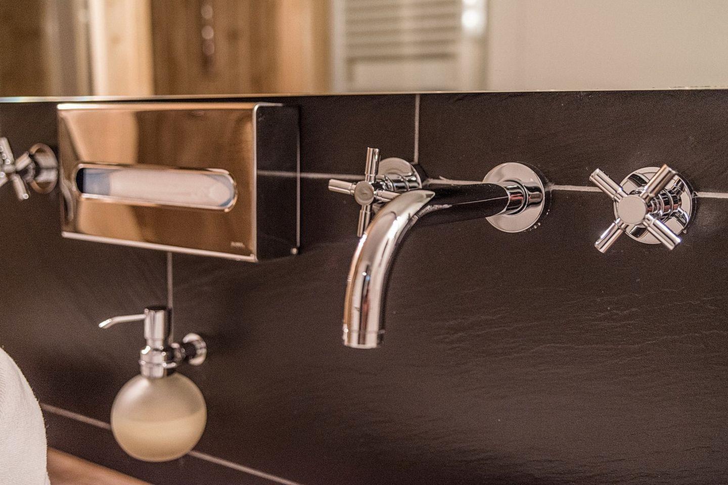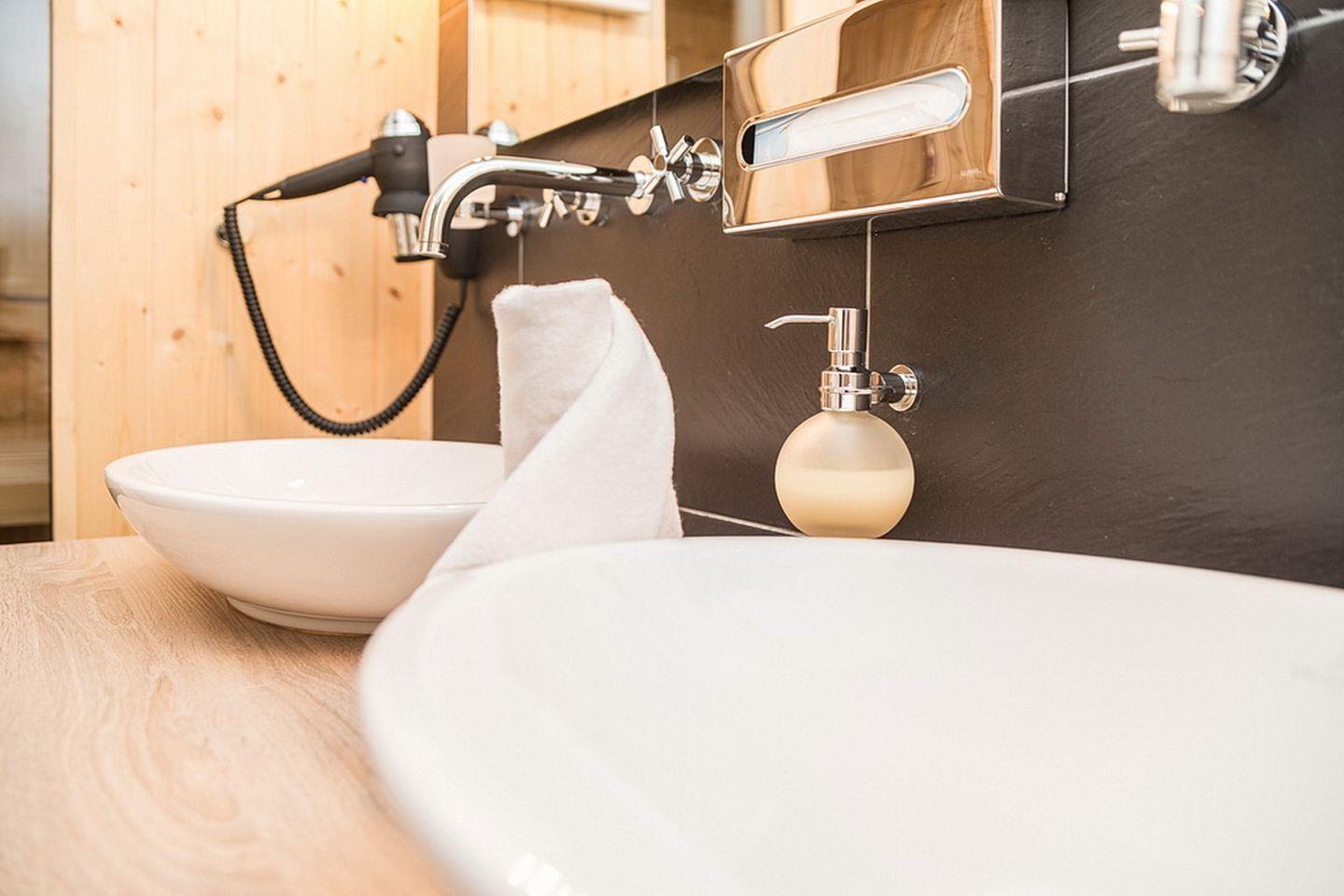Im komfortablen Badezimmer mit begehbarer Dusche, Föhn und Kosmetikspiegel befindet sich eine eigene Sauna zur vollkommenen Entspannung in privater Atmosphäre. Ideal für Familien oder den längeren Aufenthalt: das Apartment verfügt über eine eigene Waschmaschine im separaten WC. Die schöne Terrasse mit Gartenmöbeln und eigenem Strandkorb macht das Urlaubsdomizil perfekt.