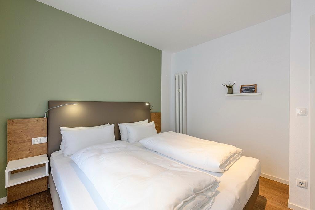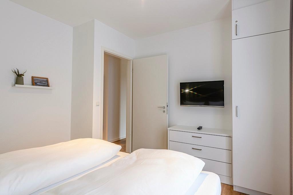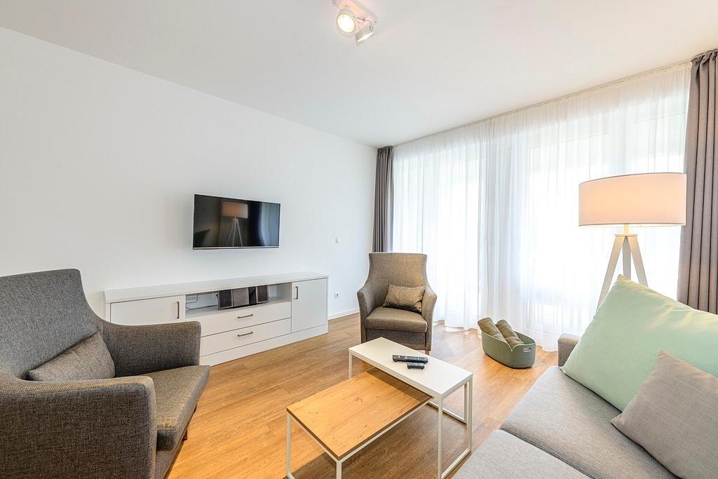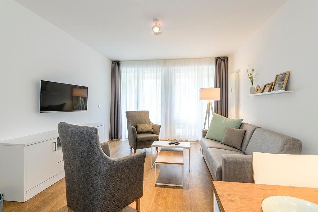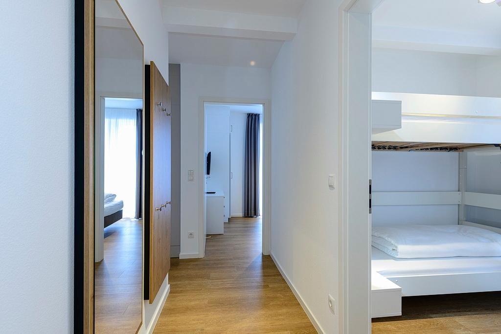 Das geschmackvoll eingerichtete Nichtraucher-Apartment verfügt über kostenfreies WLAN. Der Wohnbereich mit Schlafcouch, bietet eine voll ausgestattete offene Küchenzeile mit Geschirrspüler, Gefrierfach, Kaffeemaschine, Toaster, Wasserkocher und Mikrowelle mit Backfunktion sowie einen großen Flatscreen-TV und ein Radio. Das Apartment verfügt über einen Esstisch für 5 Personen und einen behaglichen Sitzbereich. Zwei separate Schlafzimmer stehen euch zur Verfügung. Eines davon verfügt über ein Doppelbett und einen eigenen Flatscreen-TV, ein weiteres über ein Etagenbett. Ein Kinderbett kann gegen Entgelt aufgestellt werden. Im stilvollen Badezimmer befinden sich eine große begehbare Dusche sowie ein Waschtisch mit Föhn und Kosmetikspiegel. Nach einem erlebnisreichen Urlaubstag lässt es sich auf der überdachten und mit Gartenmöbeln ausgestatteten Terrasse wunderbar entspannen.
