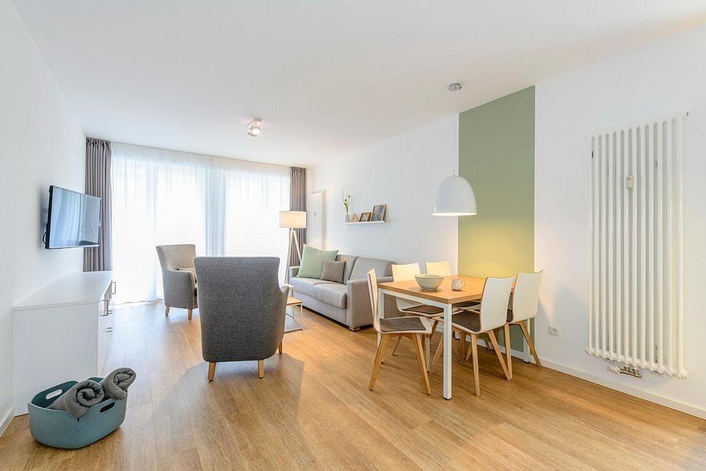 Die 59 m² große 3-Zimmer Ferienwohnung ist für bis zu 5 Personen geeignet. Besonders hervorzuheben ist die Terrasse in sonniger West-Lage mit eigener kleiner Grünfläche. Hier lässt sich den ganzen Tag das wohltuende Meeresklima des Nordseeheilbades genießen.