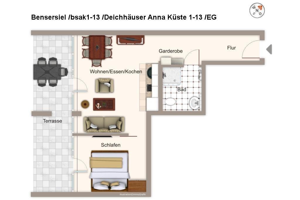 Die 47 m² große 2-Zimmer Ferienwohnung ist für bis zu 2 Personen geeignet. Besonders hervorzuheben ist die großzügige überdachte Terrasse in sonniger West-Lage mit eigener Grünfläche. Hier lässt sich den ganzen Tag das wohltuende Meeresklima des Nordseeheilbades genießen.