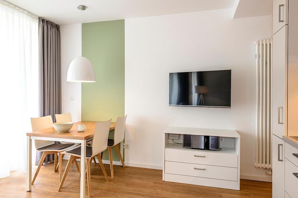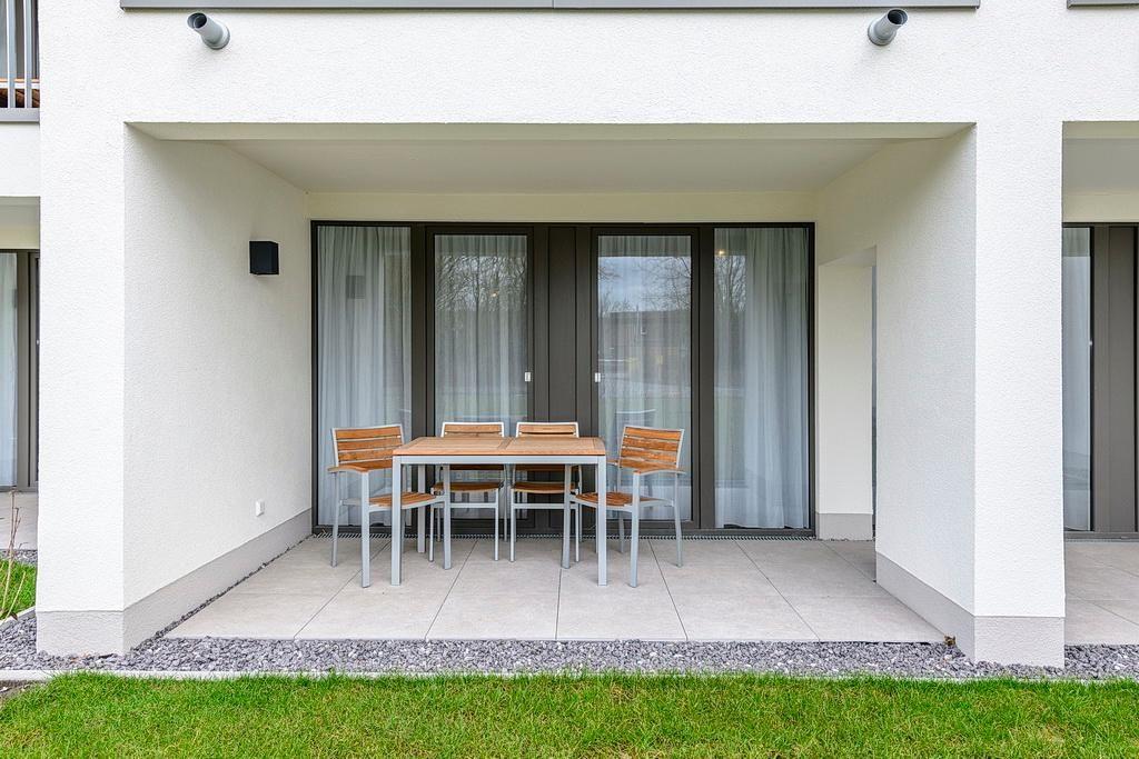 Das geschmackvoll eingerichtete Nichtraucher-Apartment verfügt über kostenfreies WLAN. Der Wohnbereich bietet eine voll ausgestattete offene Küchenzeile mit Geschirrspüler, Gefrierfach, Kaffeemaschine, Toaster, Wasserkocher und Mikrowelle mit Backfunktion sowie einen großen Flatscreen-TV und ein Radio. Das Apartment verfügt über einen Esstisch für 5 Personen und einen behaglichen Sitzbereich. Im separaten Schlafzimmer steht euch ein Doppelbett mit eigenem Flatscreen-TV zur Verfügung. Im stilvollen Badezimmer befinden sich eine große begehbare Dusche sowie ein Waschtisch mit Föhn und Kosmetikspiegel. Nach einem erlebnisreichen Urlaubstag entspannt ihr auf der überdachten und mit Gartenmöbeln für 5 Personen ausgestatteten Terrasse.