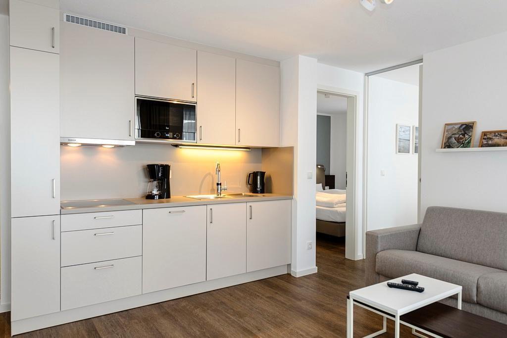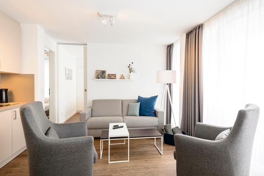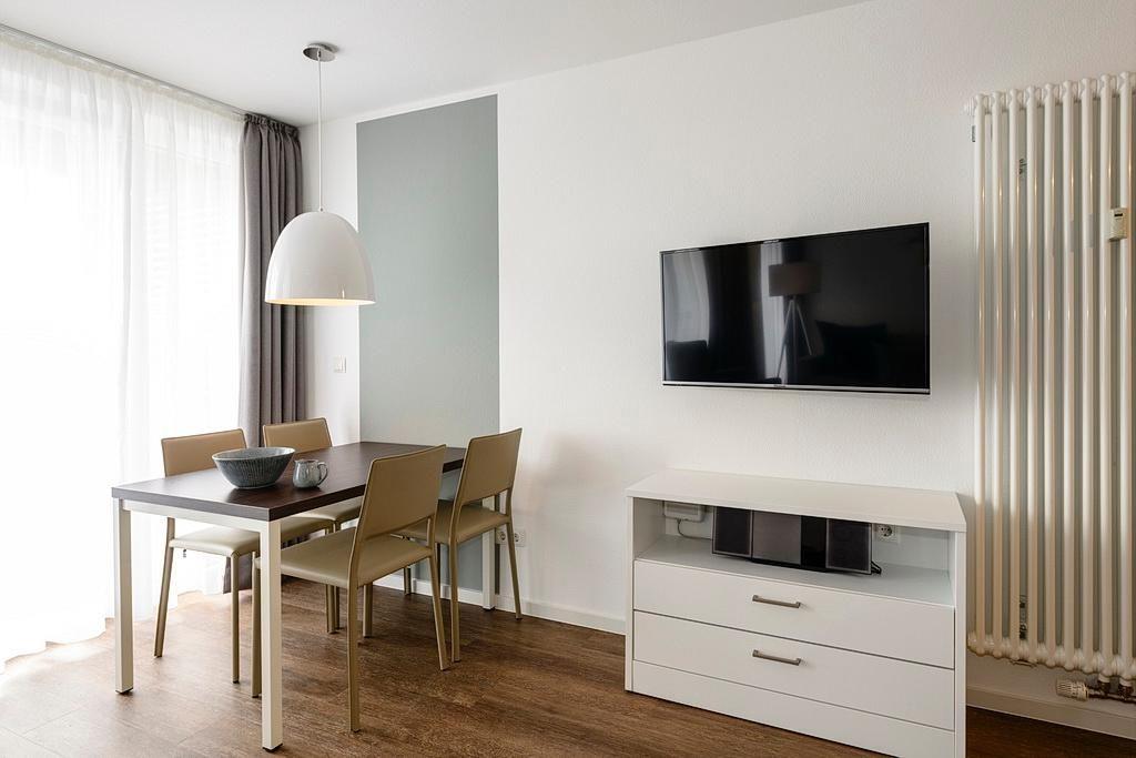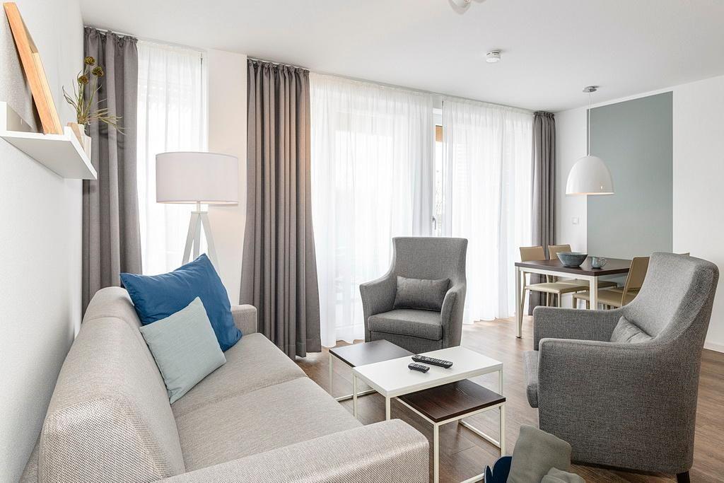 Das geschmackvoll eingerichtete Nichtraucher-Apartment verfügt über kostenfreies WLAN. Der Wohnbereich bietet eine voll ausgestattete offene Küchenzeile mit Geschirrspüler, Gefrierfach, Kaffeemaschine, Toaster, Wasserkocher und Mikrowelle mit Backfunktion sowie einen großen Flatscreen-TV und ein Radio. Das Apartment verfügt über einen Esstisch für 5 Personen und einen behaglichen Sitzbereich. Zwei separate Schlafzimmer mit jeweils einem Doppelbett stehen euch zur Verfügung. Eines davon verfügt zudem über einen eigenen Flatscreen-TV. Im stilvollen Badezimmer befinden sich eine große begehbare Dusche sowie ein Waschtisch mit Föhn und Kosmetikspiegel. Nach einem erlebnisreichen Urlaubstag entspannt ihr auf dem überdachten und mit Gartenmöbeln für 5 Personen ausgestatteten Balkon. Der Balkon ist vom Wohnbereich und vom Hauptschlafzimmer aus zugänglich.