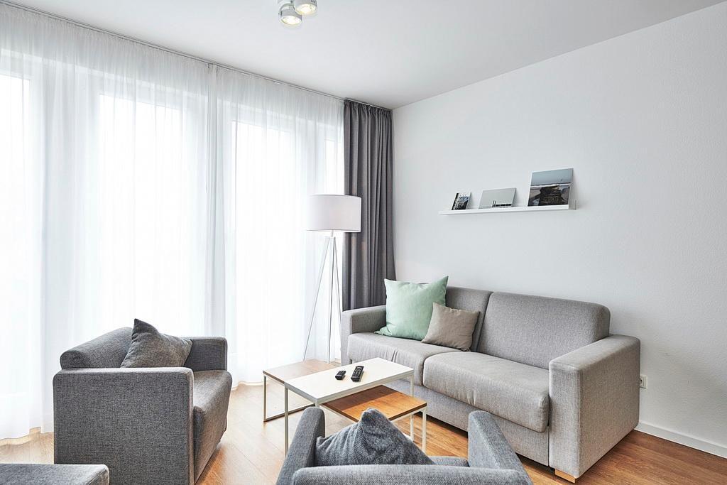 Das geschmackvoll eingerichtete Nichtraucher-Apartment verfügt über kostenfreies WLAN. Der Wohnbereich bietet eine voll ausgestattete offene Küchenzeile mit Geschirrspüler, Gefrierfach, Kaffeemaschine, Toaster, Wasserkocher und Mikrowelle mit Backfunktion sowie einen großen Flatscreen-TV und ein Radio. Das Apartment verfügt über einen Esstisch für 4 Personen und einen behaglichen Sitzbereich. Zwei separate Schlafzimmer stehen euch zur Verfügung. Eines davon verfügt über ein Doppelbett und einen eigenen Flatscreen-TV, ein weiteres über zwei Einzelbetten. Ein Kinderbett kann gegen Entgelt aufgestellt werden. Im stilvollen Badezimmer befinden sich eine große begehbare Dusche sowie ein Waschtisch mit Föhn und Kosmetikspiegel. Nach einem erlebnisreichen Urlaubstag entspannt ihr auf der überdachten und mit Gartenmöbeln für 4 Personen ausgestatteten Terrasse. Die Terrasse ist vom Wohnbereich und vom Hauptschlafzimmer aus zugänglich.