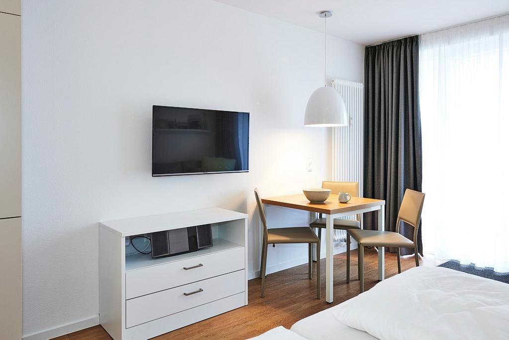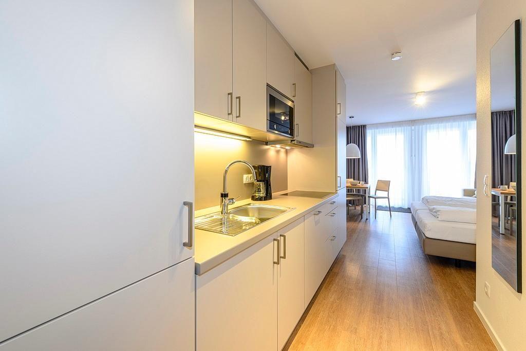 Das geschmackvoll eingerichtete Nichtraucher-Apartment verfügt über kostenfreies WLAN. Der Wohn- und Schlafbereich bietet eine voll ausgestattete offene Küchenzeile mit Geschirrspüler, Gefrierfach, Kaffeemaschine, Toaster, Wasserkocher und Mikrowelle mit Backfunktion sowie ein Doppelbett, einen großen Flatscreen-TV und ein Radio. Das Apartment verfügt über einen Esstisch für 3 Personen und einen behaglichen kleinen Sitzbereich. Ein Kinderbett kann gegen Entgelt aufgestellt werden. Im stilvollen Badezimmer befinden sich eine große begehbare Dusche sowie ein Waschtisch mit Föhn und Kosmetikspiegel. Nach einem erlebnisreichen Urlaubstag entspannt ihr auf dem überdachten und mit Gartenmöbeln für 3 Personen ausgestatteten Balkon.