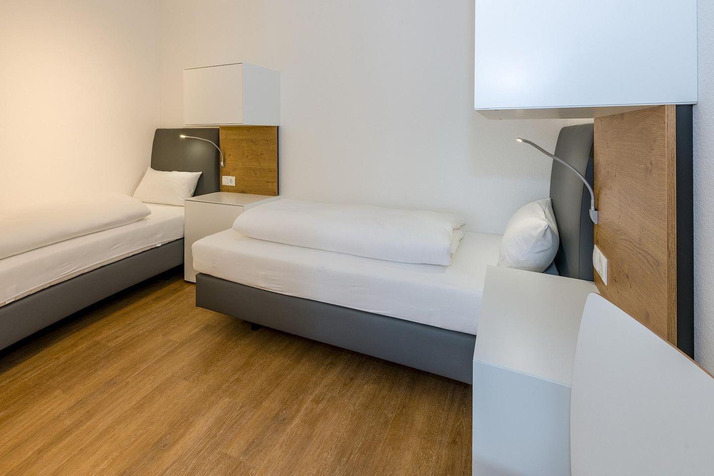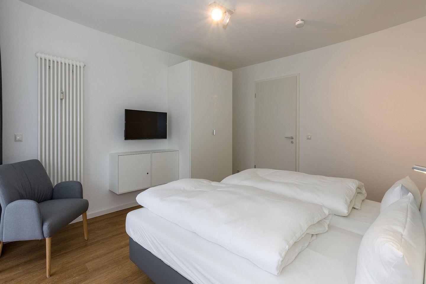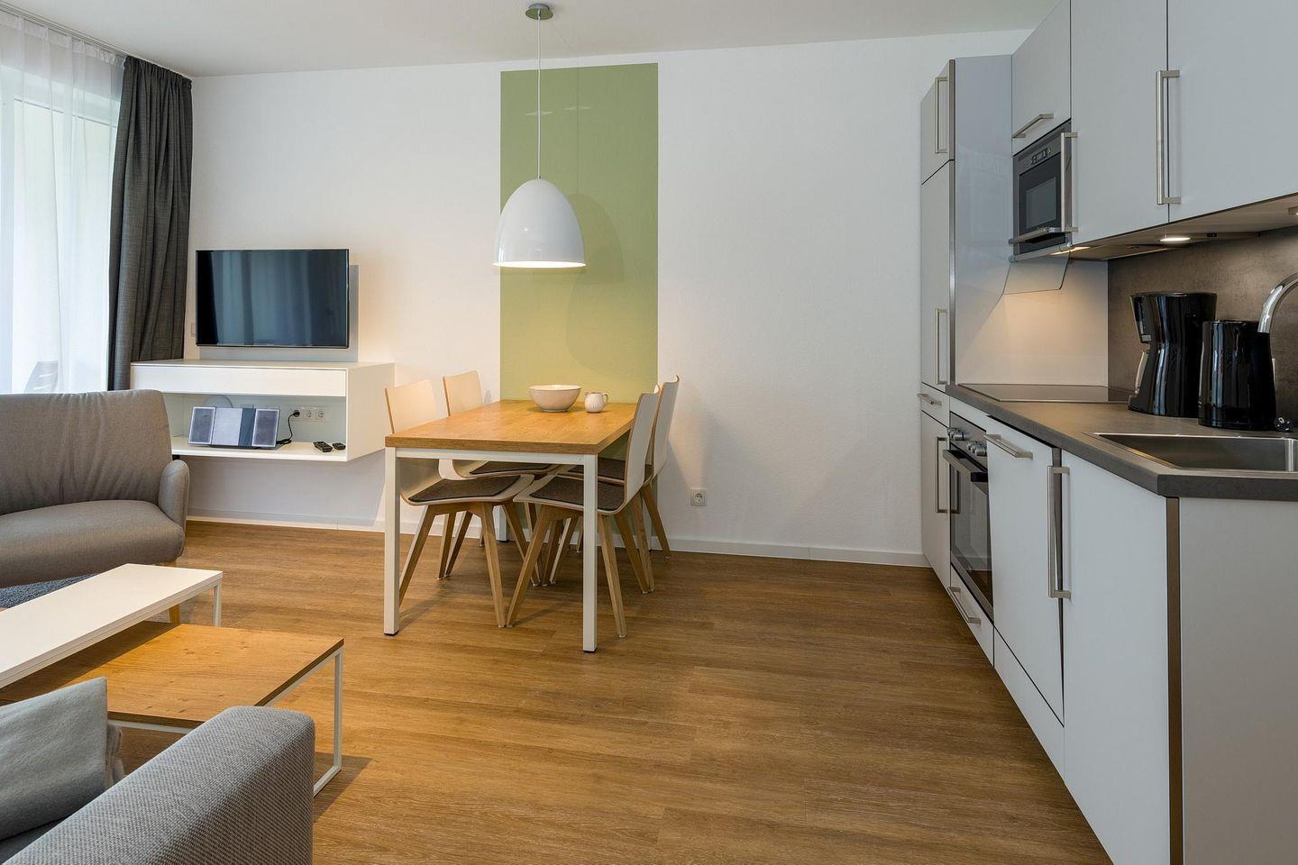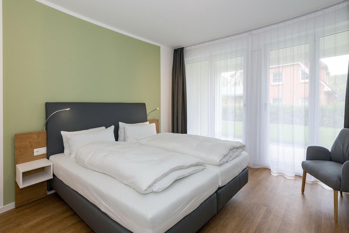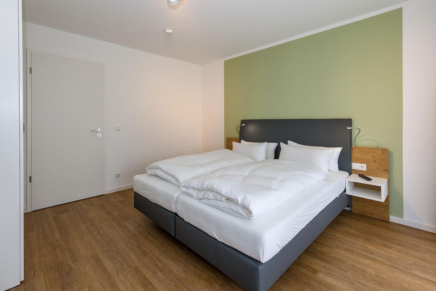 Das geschmackvoll eingerichtete Nichtraucher-Apartment verfügt über kostenfreies WLAN. Der Wohnbereich mit Schlafcouch, bietet eine voll ausgestattete offene Küchenzeile mit Geschirrspüler, Gefrierfach, Backofen, Kaffeemaschine, Toaster, Wasserkocher und Mikrowelle sowie einen großen Flatscreen-TV und ein Radio. Das Apartment verfügt über einen Esstisch für 5 Personen und einen behaglichen Sitzbereich. Zwei separate Schlafzimmer stehen euch zur Verfügung. Eines davon verfügt über ein Doppelbett und einen eigenen Flatscreen-TV, ein weiteres Alkoven-Schlafzimmer über zwei Einzelbetten. Ein Kinderbett kann gegen Entgelt aufgestellt werden. Im stilvollen Badezimmer befinden sich eine große begehbare Dusche sowie ein Waschtisch mit Föhn und Kosmetikspiegel. Nach einem erlebnisreichen Urlaubstag entspannt ihr auf den überdachten und mit Gartenmöbeln (für 5 Personen) ausgestatteten Terrassen. Die Terrassen sind vom Wohnbereich bzw. vom Hauptschlafzimmer aus zugänglich.