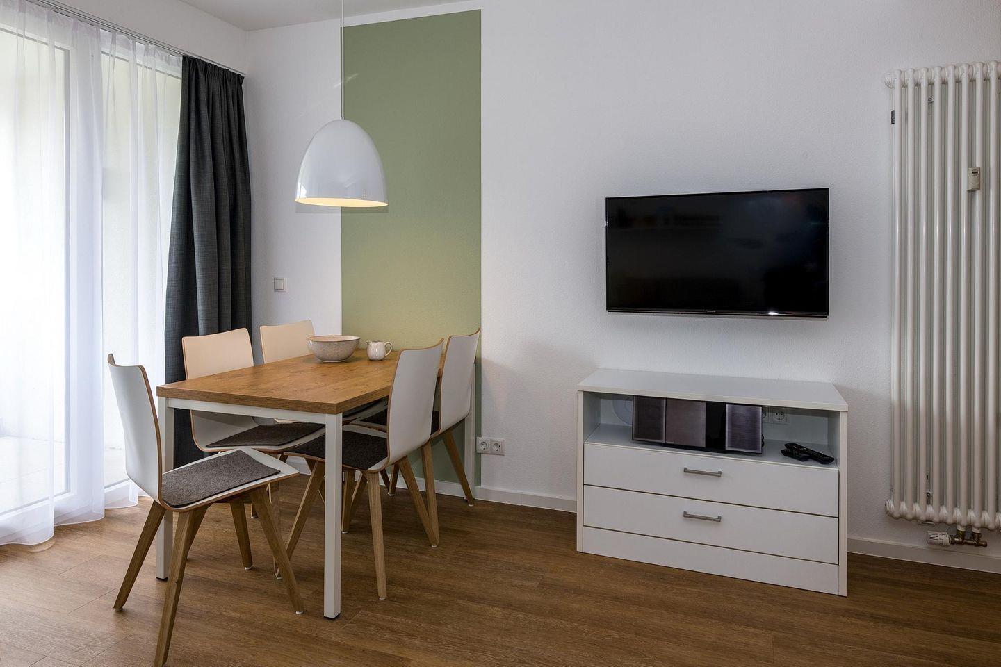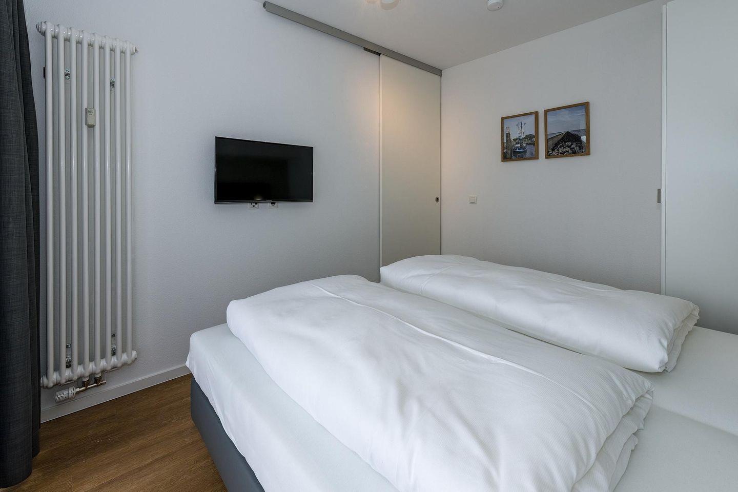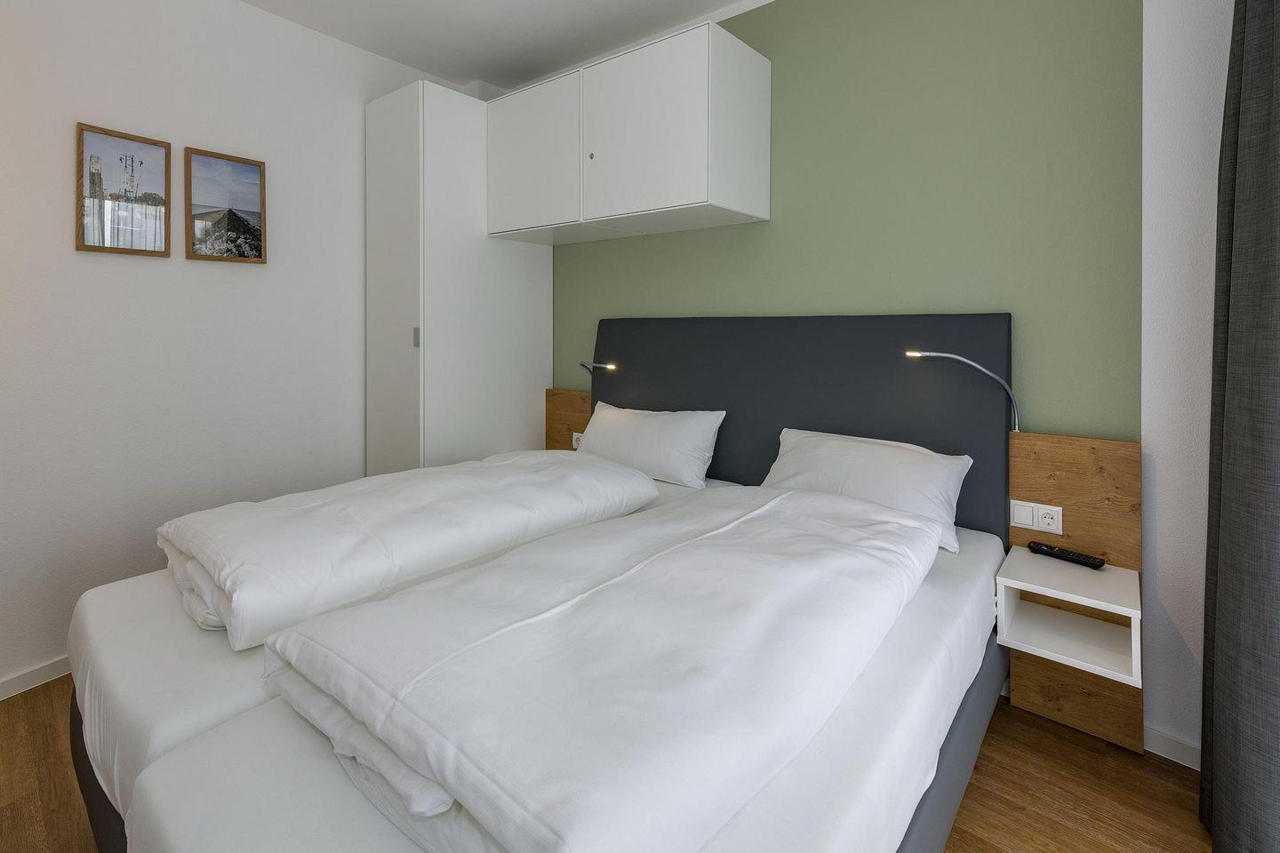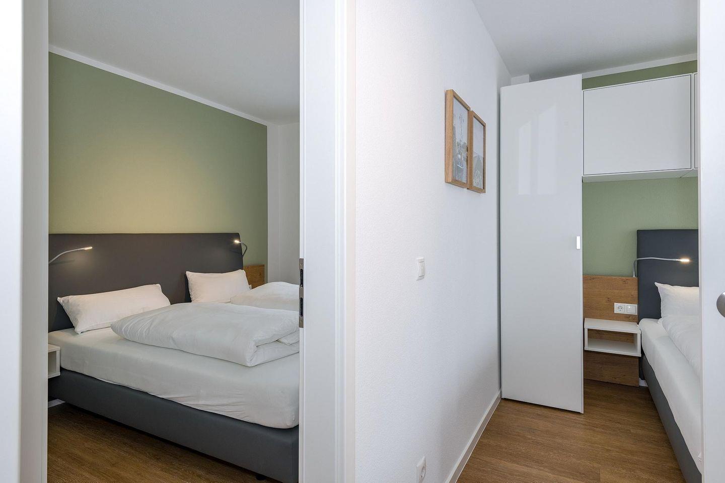 Das geschmackvoll eingerichtete Nichtraucher-Apartment verfügt über kostenfreies WLAN. Der Wohnbereich mit Couch bietet eine voll ausgestattete offene Küchenzeile mit Geschirrspüler, Backofen, Gefrierfach, Kaffeemaschine, Toaster, Wasserkocher und Mikrowelle sowie einen großen Flatscreen-TV und ein Radio. Das Apartment verfügt über einen Esstisch für 5 Personen und einen behaglichen Sitzbereich. Zwei separate Schlafzimmer stehen euch zur Verfügung. Eines davon verfügt über ein Doppelbett mit einer Überlange von 2,10 m und einen eigenen Flatscreen-TV, ein weiteres Schlafzimmer ist ebenfalls mit einem Doppelbett ausgestattet. Ein Kinderbett kann gegen Entgelt aufgestellt werden. Im stilvollen Badezimmer befinden sich eine große begehbare Dusche sowie ein Waschtisch mit Föhn und Kosmetikspiegel. Nach einem erlebnisreichen Urlaubstag entspannt ihr auf dem überdachten und mit Gartenmöbeln für 5 Personen ausgestatteten Balkon.