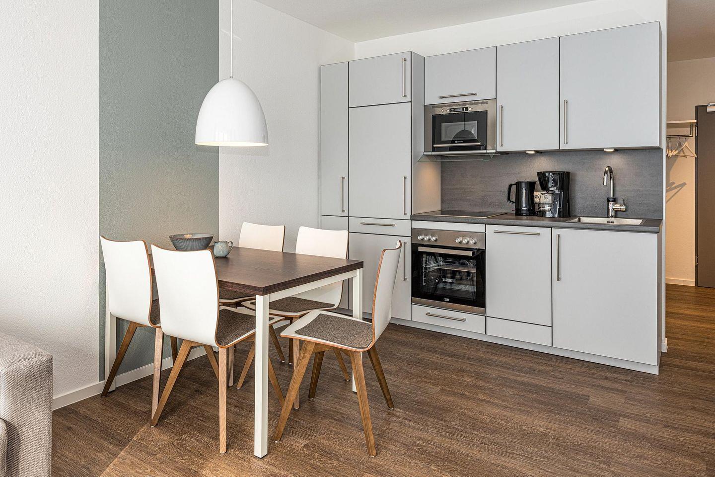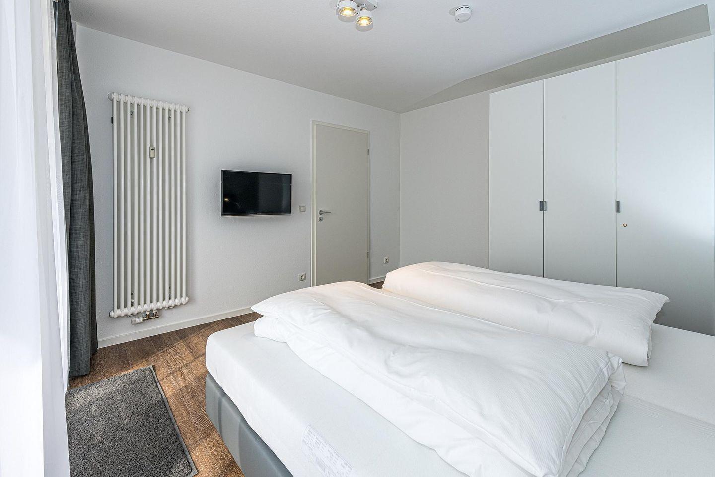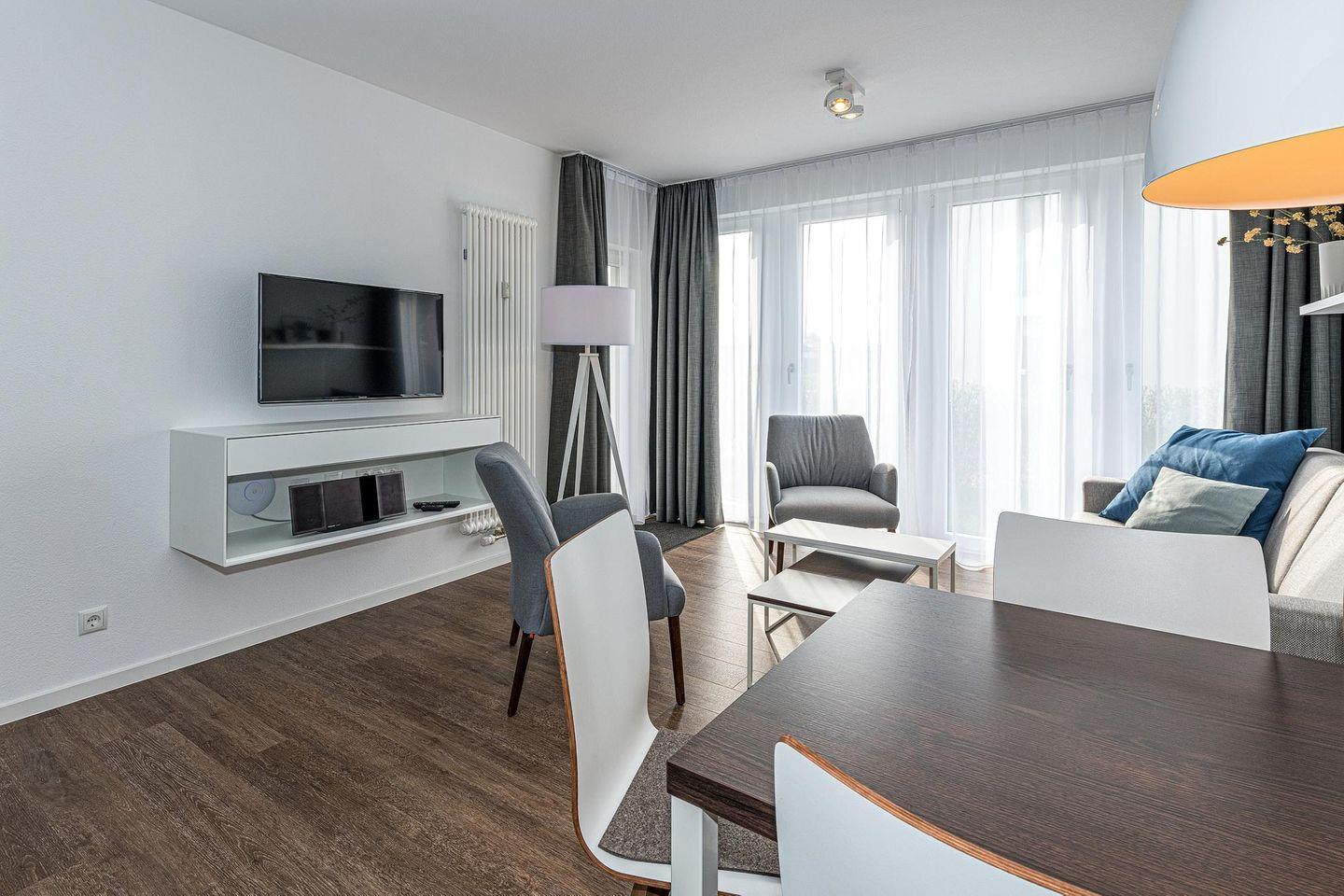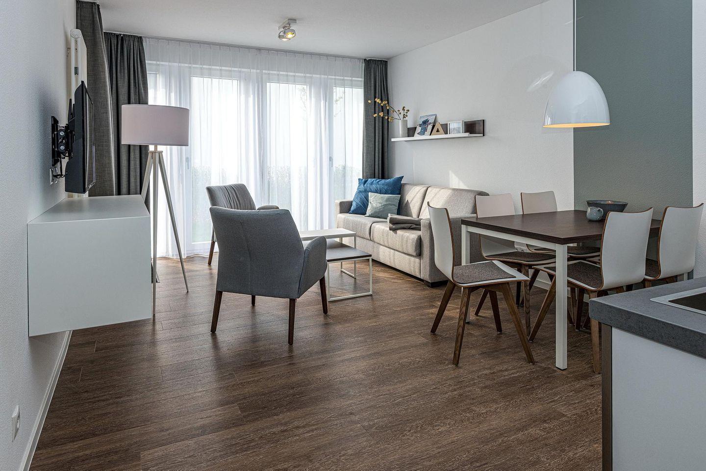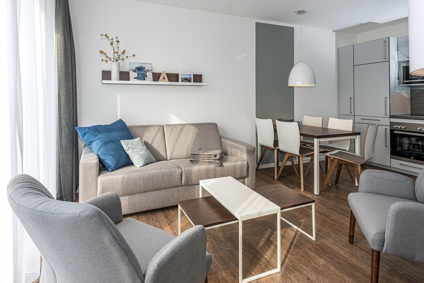 Das geschmackvoll eingerichtete Nichtraucher-Apartment verfügt über kostenfreies WLAN. Der Wohnbereich mit einer Schlafcouch bietet eine voll ausgestattete offene Küchenzeile mit Geschirrspüler, Gefrierfach, Kaffeemaschine, Toaster, Wasserkocher, Mikrowelle und Backofen sowie einen großen Flatscreen-TV und ein Radio. Das Apartment verfügt über einen Esstisch für 5 Personen und einen behaglichen Sitzbereich. Zwei separate Schlafzimmer stehen euch zur Verfügung. Eines davon verfügt über ein Doppelbett und einen eigenen Flatscreen-TV, ein weiteres über zwei Einzelbetten. Ein Kinderbett kann gegen Entgelt aufgestellt werden. Im stilvollen Badezimmer befinden sich eine große begehbare Dusche sowie ein Waschtisch mit Föhn und Kosmetikspiegel. Nach einem erlebnisreichen Urlaubstag entspannt ihr auf dem überdachten und mit Gartenmöbeln für 4 Personen ausgestatteten Terrasse.
