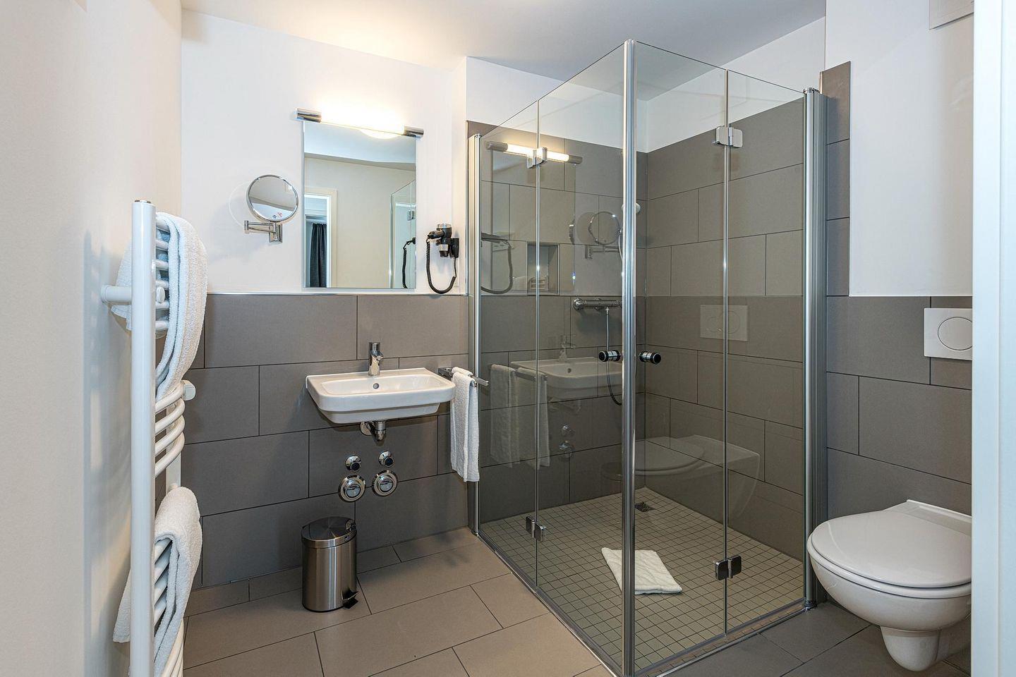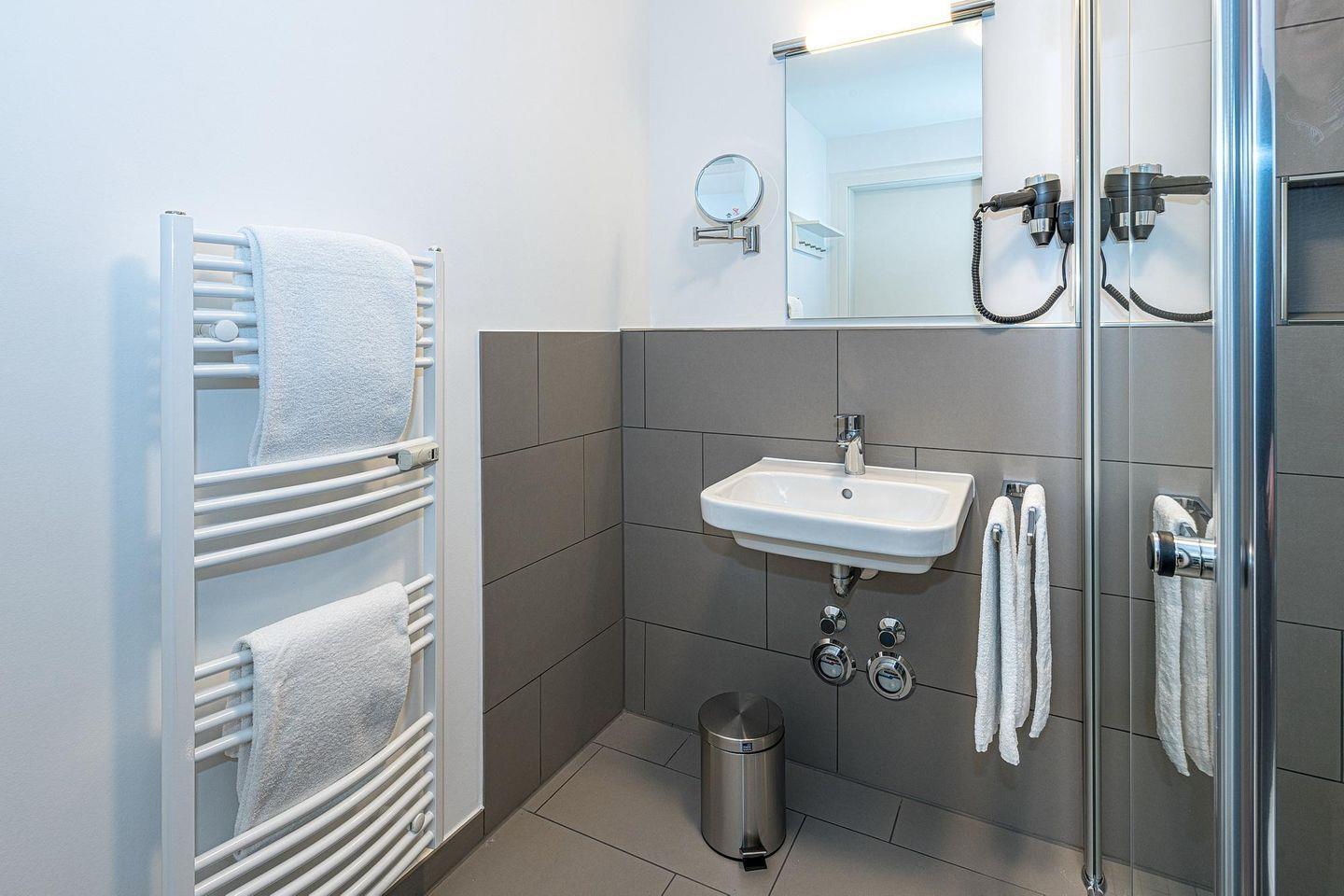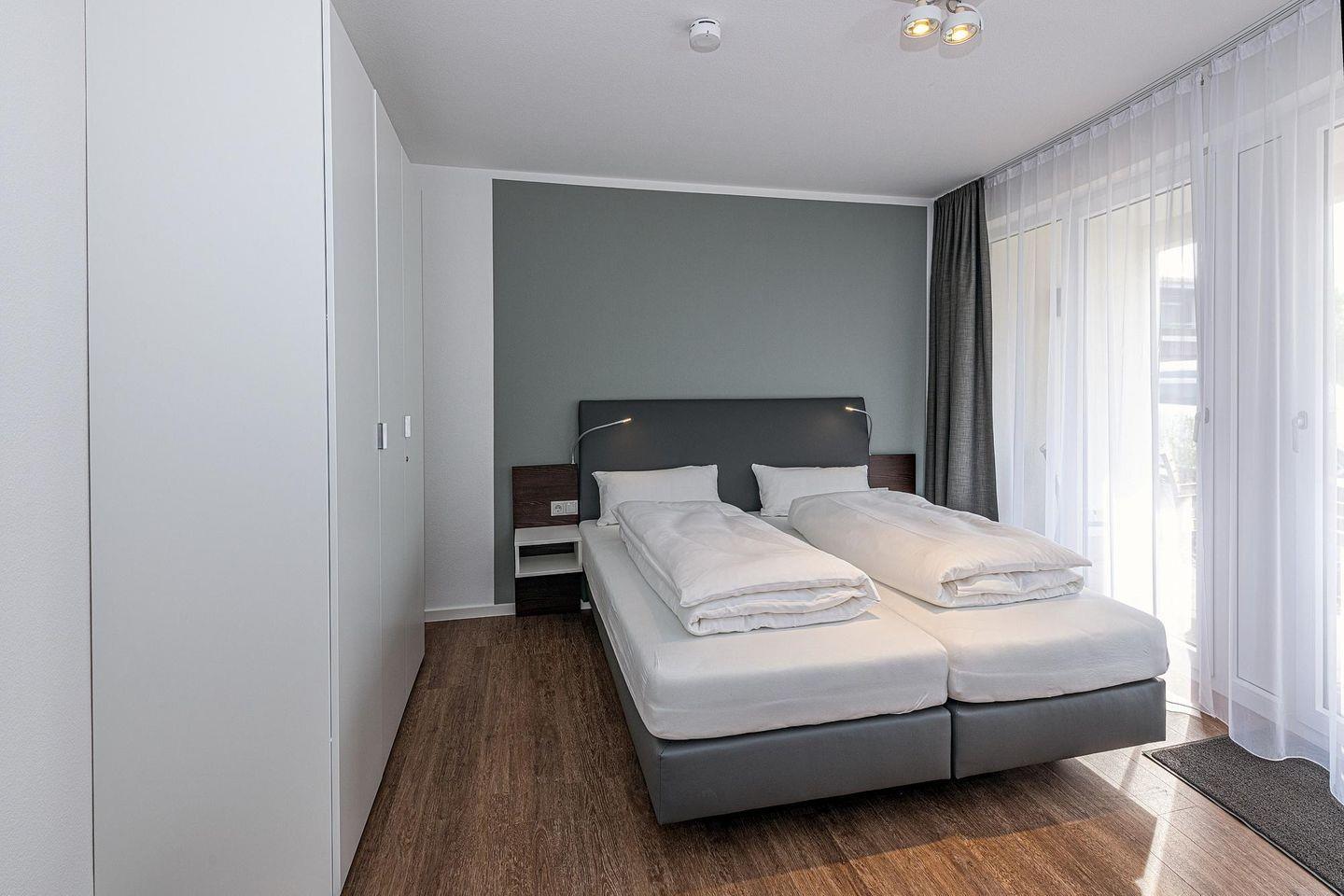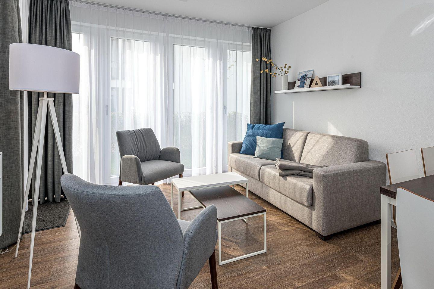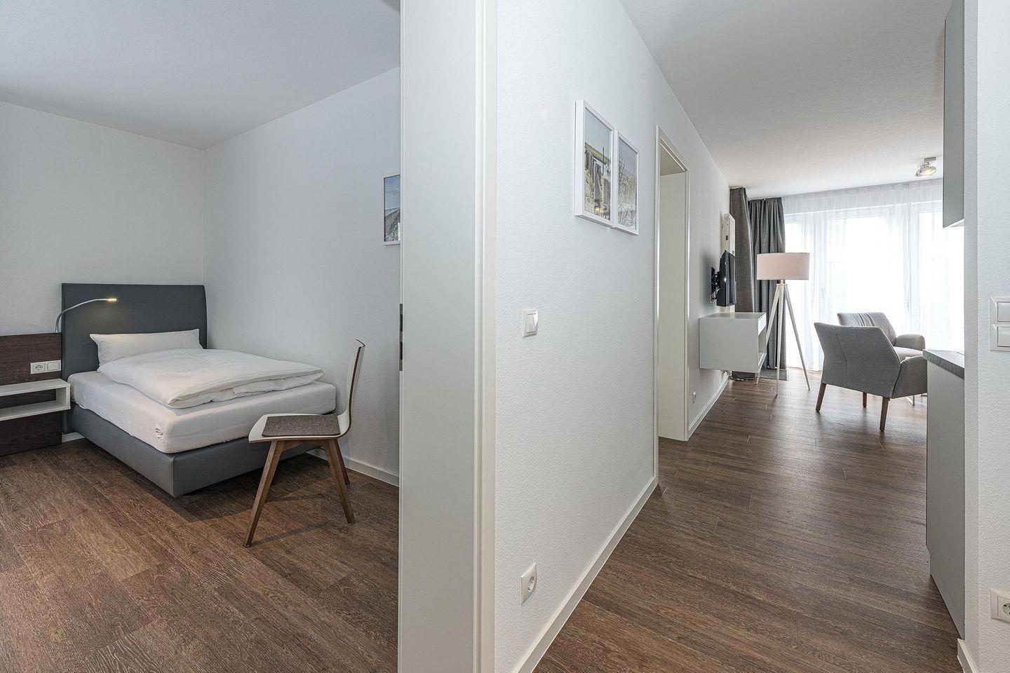 Das geschmackvoll eingerichtete Nichtraucher-Apartment verfügt über kostenfreies WLAN. Der Wohnbereich mit einer Schlafcouch bietet eine voll ausgestattete offene Küchenzeile mit Geschirrspüler, Gefrierfach, Kaffeemaschine, Toaster, Wasserkocher, Mikrowelle und Backofen sowie einen großen Flatscreen-TV und ein Radio. Das Apartment verfügt über einen Esstisch für 5 Personen und einen behaglichen Sitzbereich. Zwei separate Schlafzimmer stehen euch zur Verfügung. Eines davon verfügt über ein Doppelbett und einen eigenen Flatscreen-TV, ein weiteres über zwei Einzelbetten. Ein Kinderbett kann gegen Entgelt aufgestellt werden. Im stilvollen Badezimmer befinden sich eine große begehbare Dusche sowie ein Waschtisch mit Föhn und Kosmetikspiegel. Nach einem erlebnisreichen Urlaubstag entspannt ihr auf dem überdachten und mit Gartenmöbeln für 4 Personen ausgestatteten Terrasse.