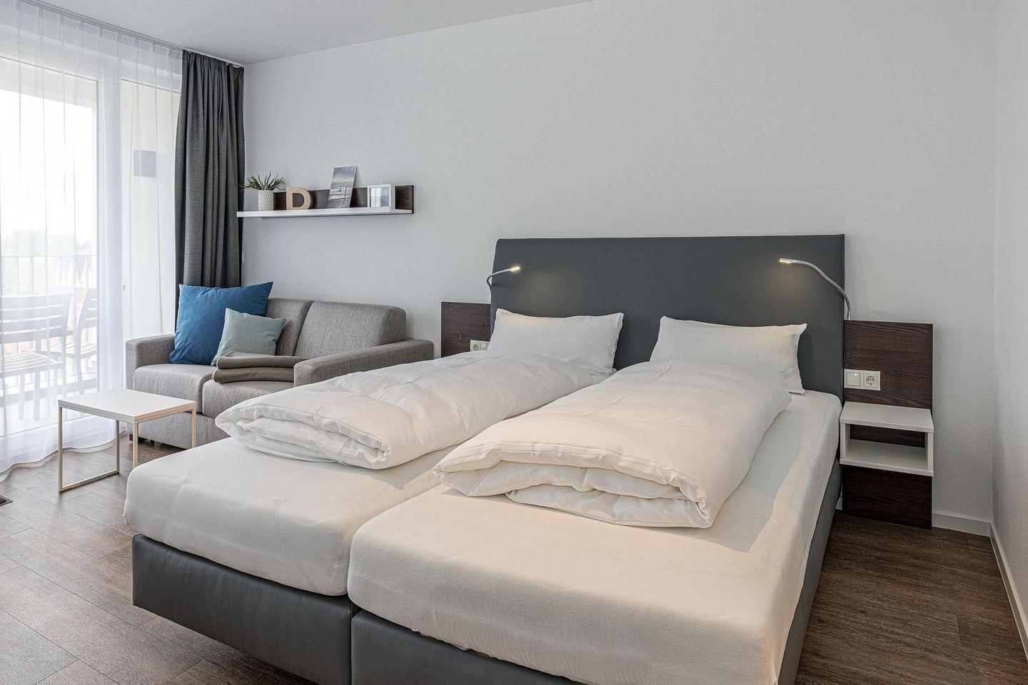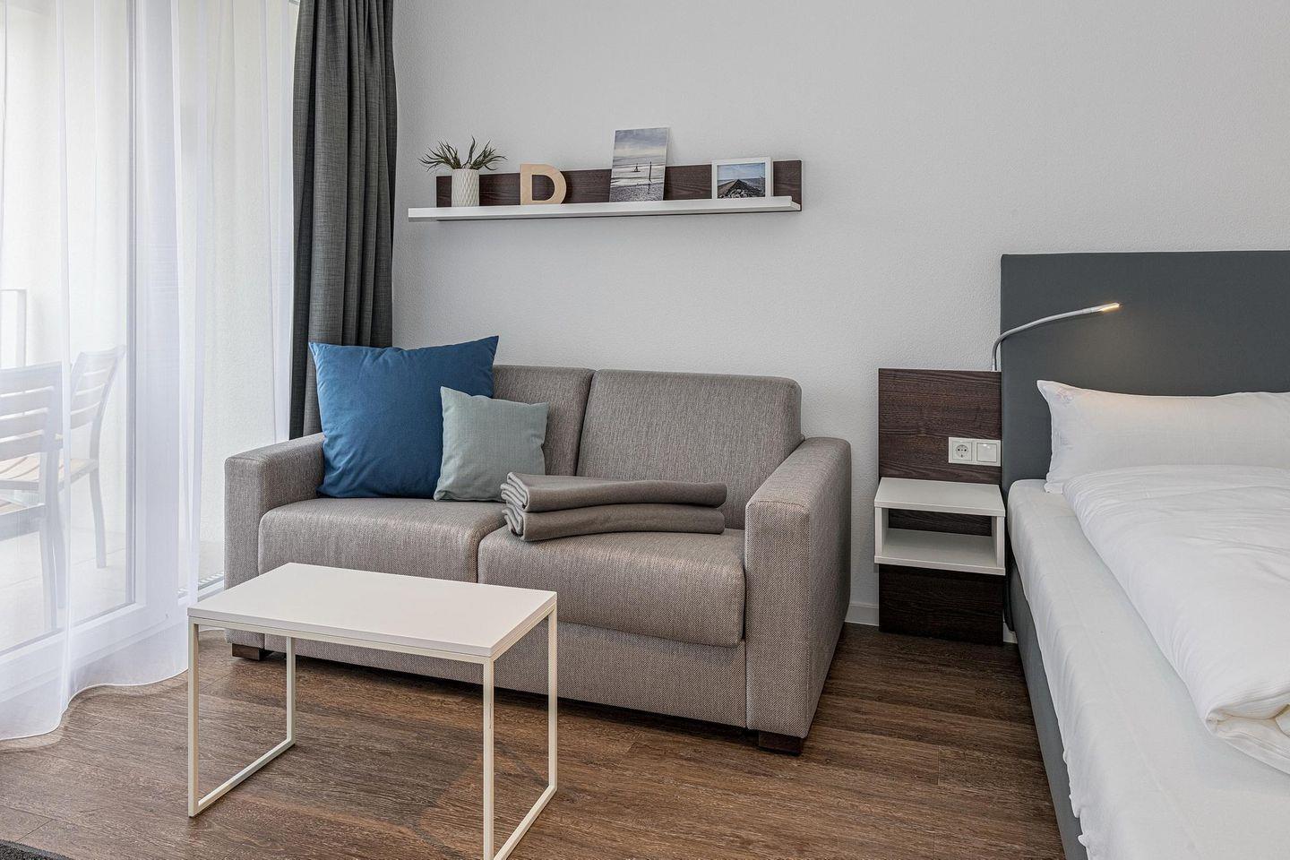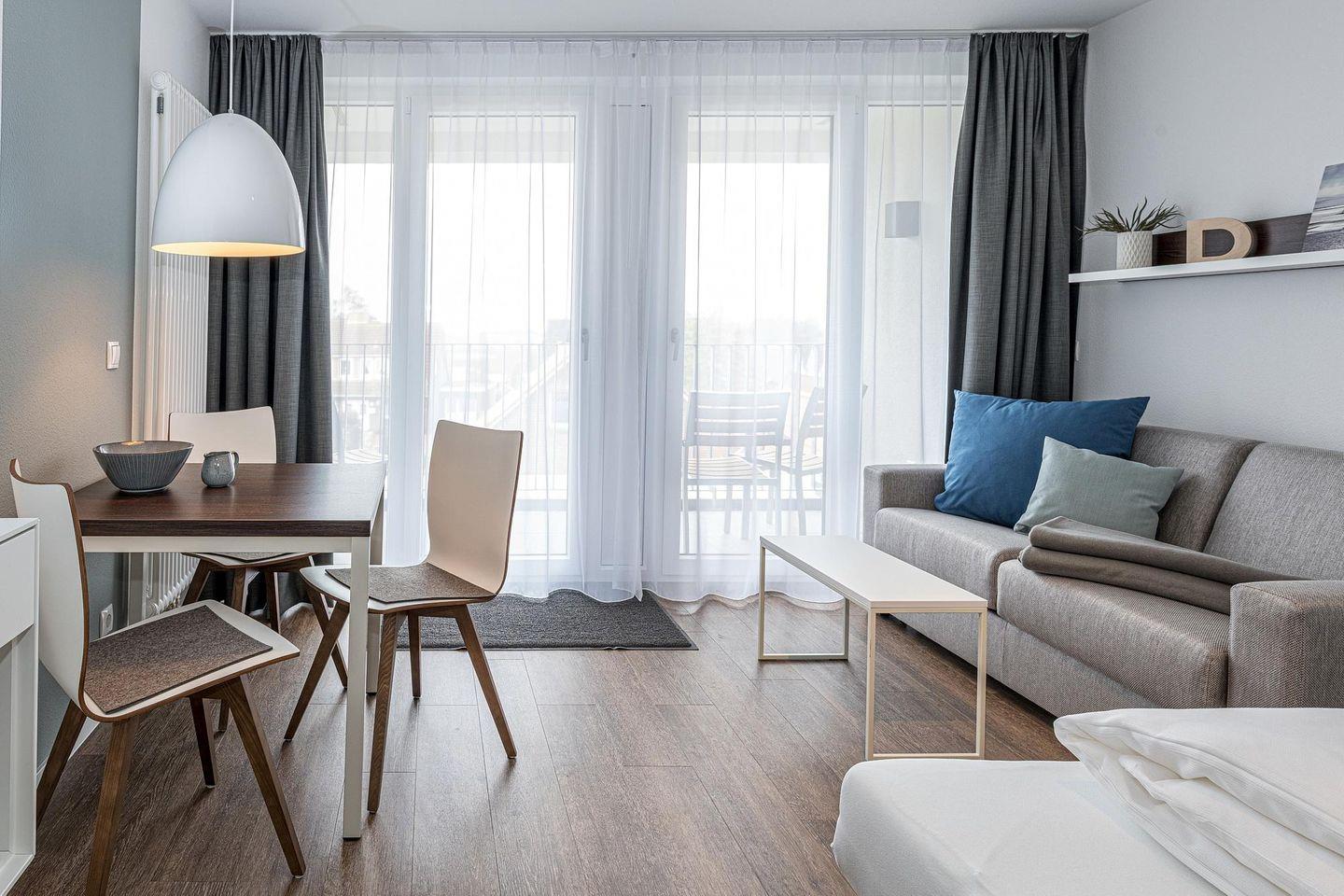Das geschmackvoll eingerichtete Nichtraucher-Apartment verfügt über kostenfreies WLAN. Der Wohn-Schlafbereich mit Schlafcouch, bietet eine voll ausgestattete offene Küchenzeile mit Geschirrspüler, Gefrierfach, Backofen, Kaffeemaschine, Toaster, Wasserkocher und Mikrowelle sowie ein Doppelbett, einen großen Flatscreen-TV und ein Radio. Das Apartment verfügt über einen Esstisch für 3 Personen und einen behaglichen kleinen Sitzbereich. Im stilvollen Badezimmer befinden sich eine große begehbare Dusche sowie ein Waschtisch mit Föhn und Kosmetikspiegel. Nach einem erlebnisreichen Urlaubstag entspannt ihr auf dem überdachten und mit Gartenmöbeln für 3 Personen ausgestatteten Balkon.