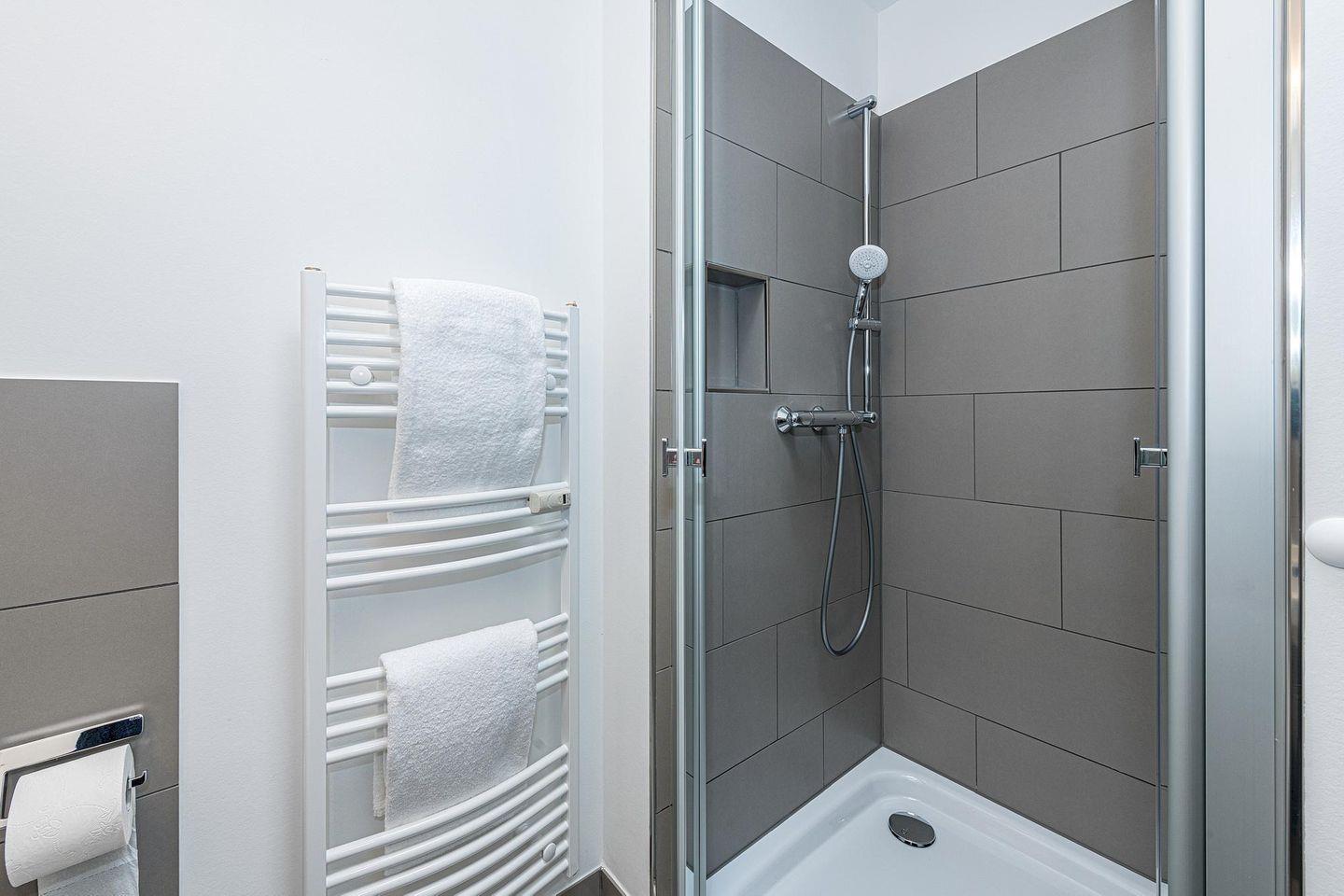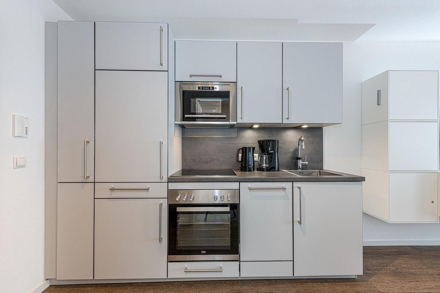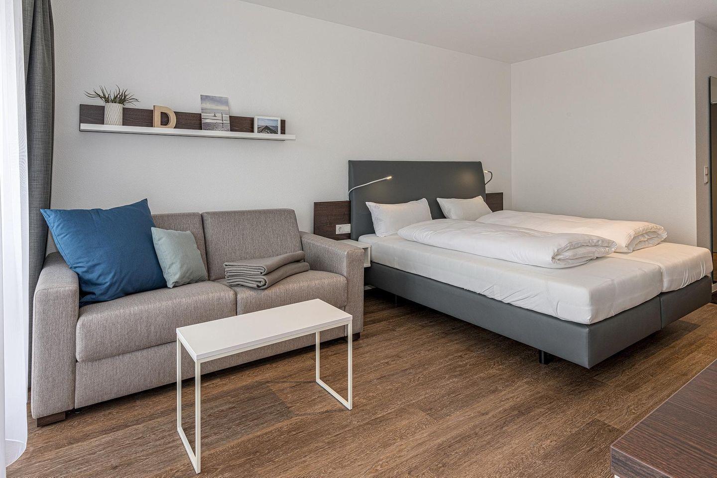 Das geschmackvoll eingerichtete Nichtraucher-Apartment verfügt über kostenfreies WLAN. Der Wohn-Schlafbereich mit Schlafcouch, bietet eine voll ausgestattete offene Küchenzeile mit Geschirrspüler, Gefrierfach, Backofen, Kaffeemaschine, Toaster, Wasserkocher und Mikrowelle sowie ein Doppelbett, einen großen Flatscreen-TV und ein Radio. Das Apartment verfügt über einen Esstisch für 3 Personen und einen behaglichen kleinen Sitzbereich. Im stilvollen Badezimmer befinden sich eine große begehbare Dusche sowie ein Waschtisch mit Föhn und Kosmetikspiegel. Nach einem erlebnisreichen Urlaubstag entspannt ihr auf dem überdachten und mit Gartenmöbeln für 3 Personen ausgestatteten Balkon.