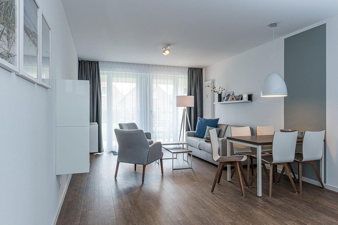 Die 59 m² große 3-Zimmer Ferienwohnung ist für bis zu 5 Personen geeignet. Besonders hervorzuheben ist der großzügige und überdachte Terrasse, ähnlich einer Loggia, in sonniger Süd West-Lage mit Nutzung des Gartens. Hier lässt sich bis zum Abend das wohltuende Meeresklima und die Sonne genießen.