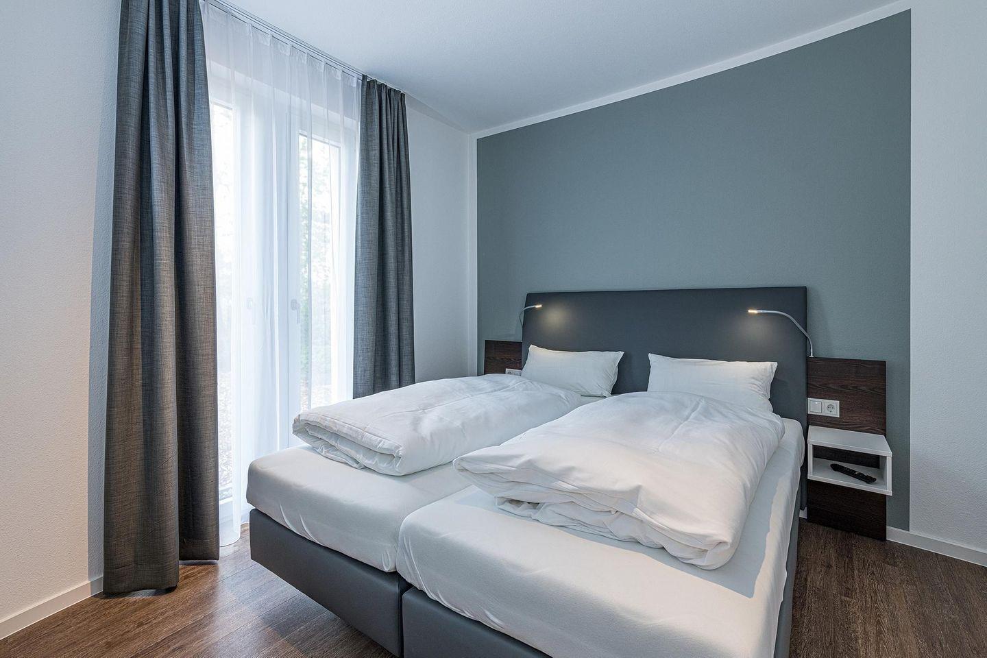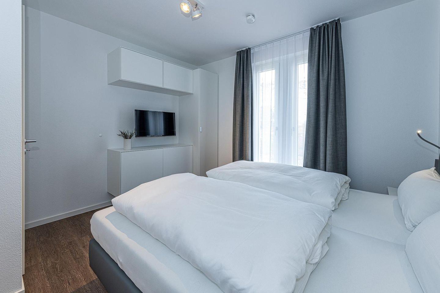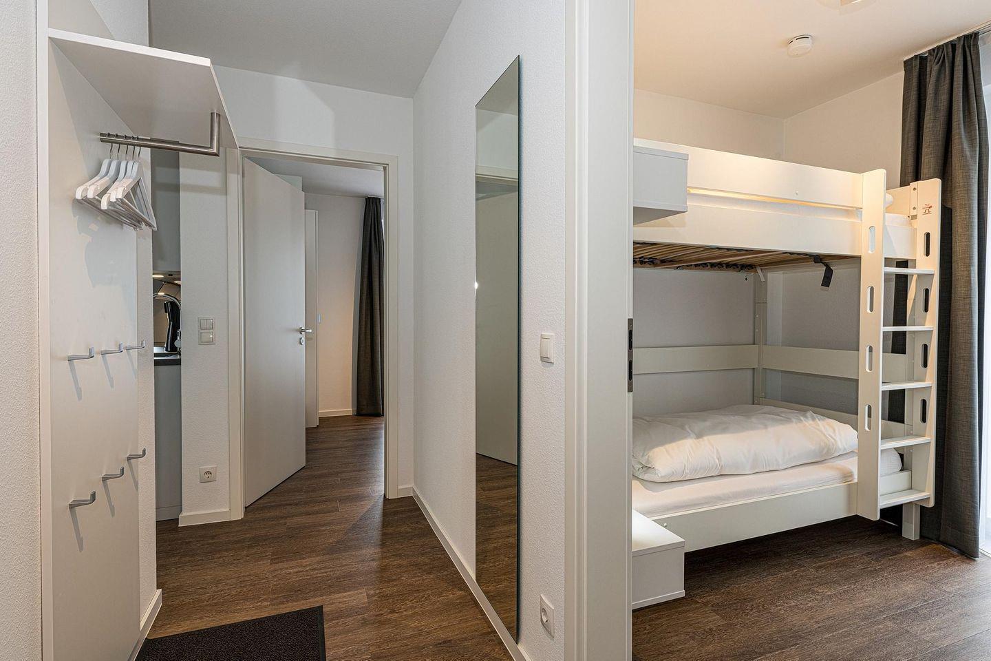 Das geschmackvoll eingerichtete Nichtraucher-Apartment verfügt über kostenfreies WLAN. Der Wohnbereich bietet eine voll ausgestattete offene Küchenzeile mit Geschirrspüler, Gefrierfach, Backofen, Kaffeemaschine, Toaster, Wasserkocher und Mikrowelle sowie einen großen Flatscreen-TV und ein Radio. Das Apartment verfügt über einen Esstisch für 5 Personen und einen behaglichen Sitzbereich. Zwei separate Schlafzimmer mit einem Doppelbett bzw. einem Etagenbett stehen euch zur Verfügung. Eines davon verfügt zudem über einen eigenen Flatscreen-TV. Im stilvollen Badezimmer befinden sich eine große begehbare Dusche sowie ein Waschtisch mit Föhn und Kosmetikspiegel. Nach einem erlebnisreichen Urlaubstag entspannt ihr auf der überdachten und mit Gartenmöbeln für 5 Personen ausgestatteten Terrasse. Die Terrasse ist vom Wohnbereich zugänglich.
