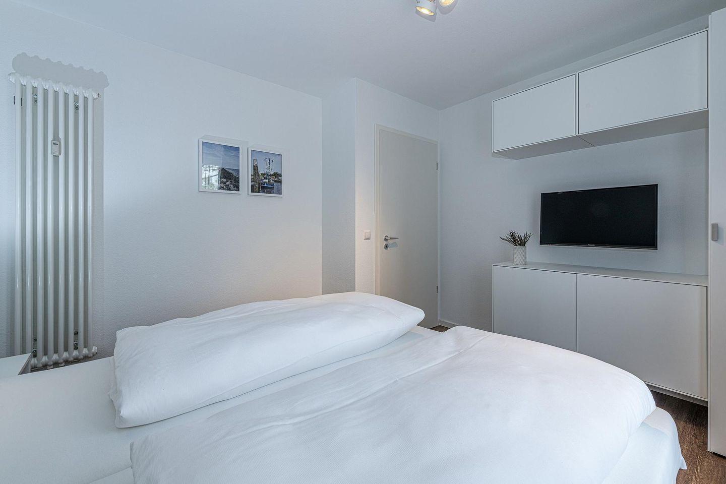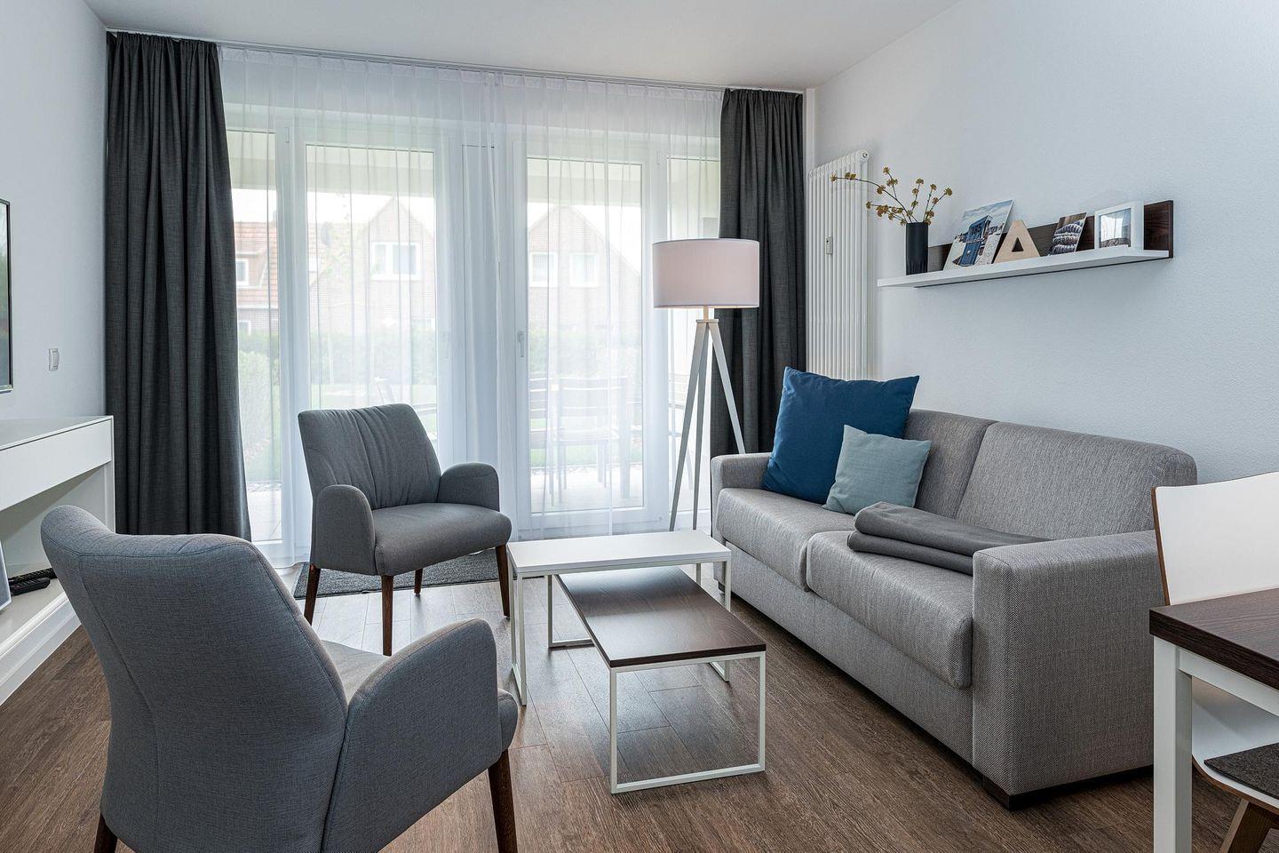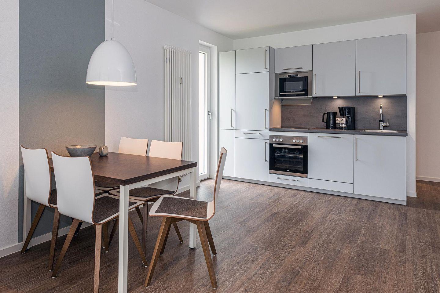 Das geschmackvoll eingerichtete Nichtraucher-Apartment verfügt über kostenfreies WLAN. Der Wohnbereich bietet eine voll ausgestattete offene Küchenzeile mit Geschirrspüler, Gefrierfach, Backofen, Kaffeemaschine, Toaster, Wasserkocher und Mikrowelle sowie einen großen Flatscreen-TV und ein Radio. Das Apartment verfügt über einen Esstisch für 5 Personen und einen behaglichen Sitzbereich. Zwei separate Schlafzimmer mit einem Doppelbett bzw. einem Etagenbett stehen euch zur Verfügung. Eines davon verfügt zudem über einen eigenen Flatscreen-TV. Im stilvollen Badezimmer befinden sich eine große begehbare Dusche sowie ein Waschtisch mit Föhn und Kosmetikspiegel. Nach einem erlebnisreichen Urlaubstag entspannt ihr auf der überdachten und mit Gartenmöbeln für 5 Personen ausgestatteten Terrasse. Die Terrasse ist vom Wohnbereich zugänglich.