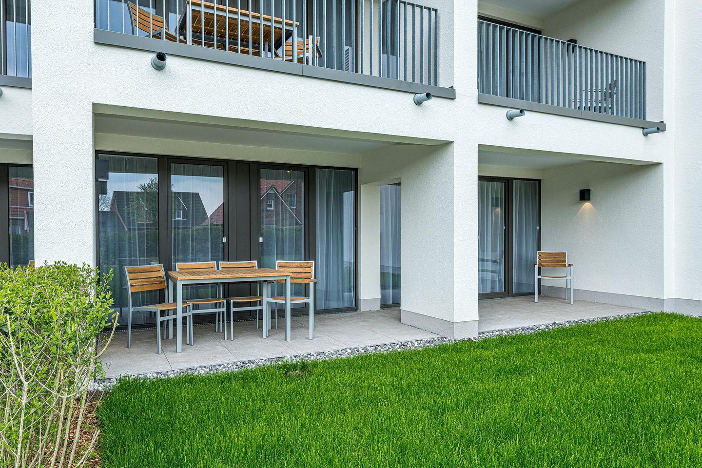 Das geschmackvoll eingerichtete Nichtraucher-Apartment verfügt über kostenfreies WLAN. Der Wohnbereich mit Schlafcouch bietet eine voll ausgestattete offene Küchenzeile mit Geschirrspüler, Gefrierfach, Kaffeemaschine, Toaster, Wasserkocher, Mikrowelle und Backofen sowie einen großen Flatscreen-TV und ein Radio. Das Apartment verfügt über einen Esstisch und einen behaglichen Sitzbereich. Ein Schlafzimmer mit einem Doppelbett und einem Flatscreen-TV steht euch zur Verfügung. Im stilvollen Badezimmer befinden sich eine große begehbare Dusche sowie ein Waschtisch mit Föhn und Kosmetikspiegel. Nach einem erlebnisreichen Urlaubstag entspannt ihr auf der überdachten und mit Gartenmöbeln für 5 Personen ausgestattete Terrasse.