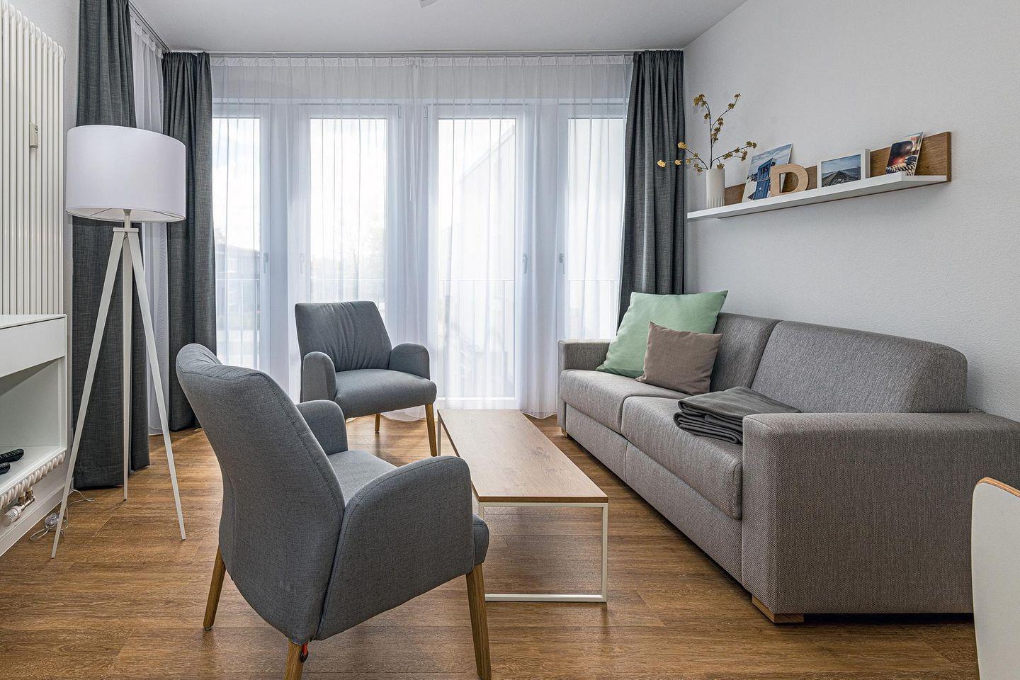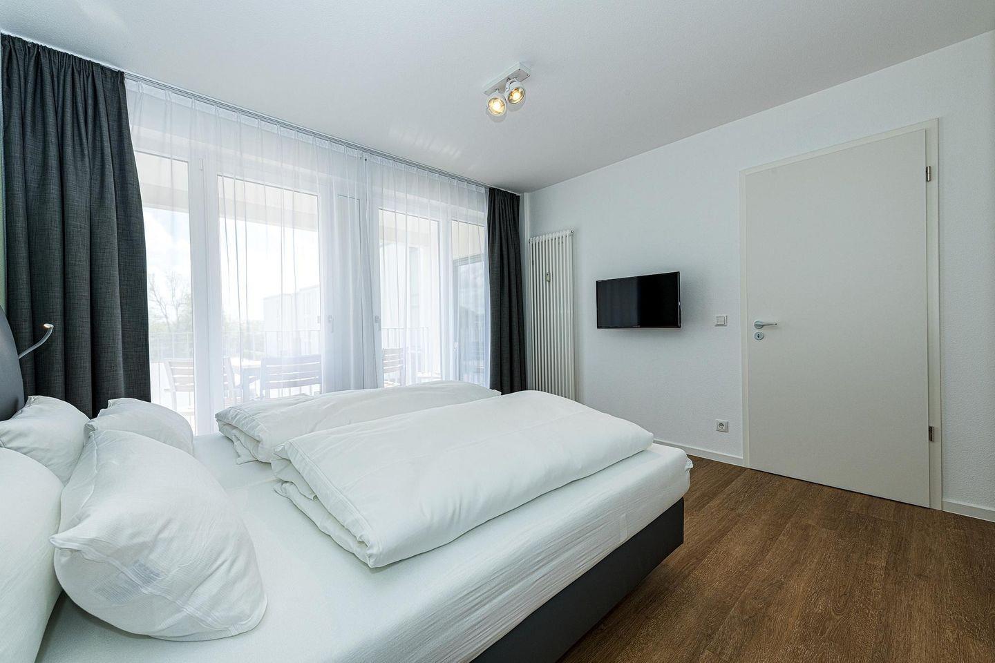 Das geschmackvoll eingerichtete Nichtraucher-Apartment verfügt über kostenfreies WLAN. Der Wohnbereich bietet eine voll ausgestattete offene Küchenzeile mit Geschirrspüler, Gefrierfach, Kaffeemaschine, Toaster, Wasserkocher, Backofen und Mikrowelle sowie einen großen Flatscreen-TV und ein Radio. Das Apartment verfügt über einen Esstisch für 5 Personen und einen behaglichen Sitzbereich mit Schlafcouch. Zwei separate Schlafzimmer stehen euch zur Verfügung. Eines davon verfügt über ein Doppelbett und einen eigenen Flatscreen-TV, ein weiteres über zwei Einzelbetten. Ein Kinderbett kann gegen Entgelt aufgestellt werden. Im stilvollen Badezimmer befinden sich eine große begehbare Dusche sowie ein Waschtisch mit Föhn und Kosmetikspiegel. Nach einem erlebnisreichen Urlaubstag entspannt ihr auf dem überdachten und mit Gartenmöbeln für 4 Personen ausgestatteten Balkon.