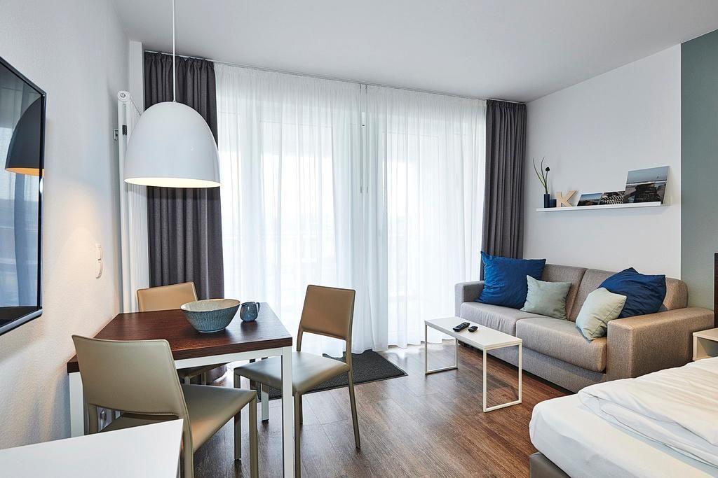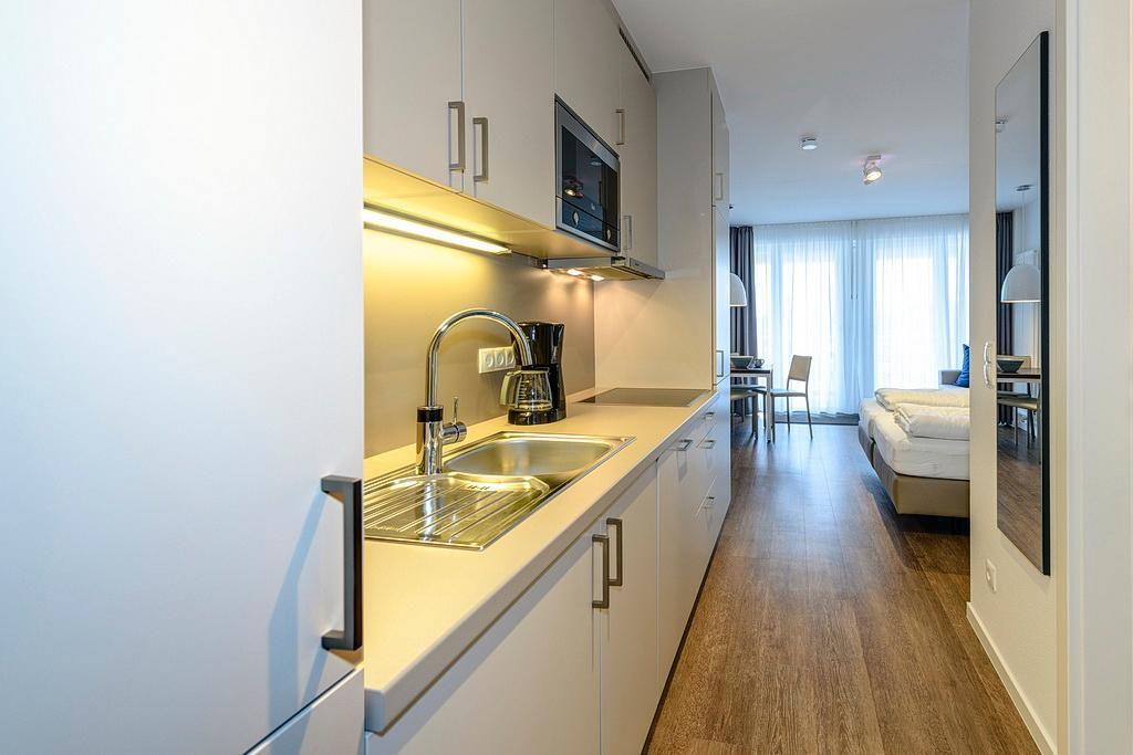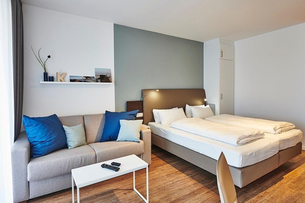 Das geschmackvoll eingerichtete Nichtraucher-Apartment verfügt über kostenfreies WLAN. Der Wohn- und Schlafbereich bietet eine voll ausgestattete offene Küchenzeile mit Geschirrspüler, Gefrierfach, Kaffeemaschine, Toaster, Wasserkocher und Mikrowelle mit Backfunktion sowie ein Doppelbett und eine Schlafcouch (1,10 x 1,90 m), einen großen Flatscreen-TV und ein Radio. Das Apartment verfügt über einen Esstisch für 3 Personen und einen behaglichen kleinen Sitzbereich. Ein Kinderbett kann gegen Entgelt aufgestellt werden. Im stilvollen Badezimmer befinden sich eine große begehbare Dusche sowie ein Waschtisch mit Föhn und Kosmetikspiegel. Nach einem erlebnisreichen Urlaubstag entspannt ihr auf dem überdachten und mit Gartenmöbeln für 3 Personen ausgestatteten Balkon.