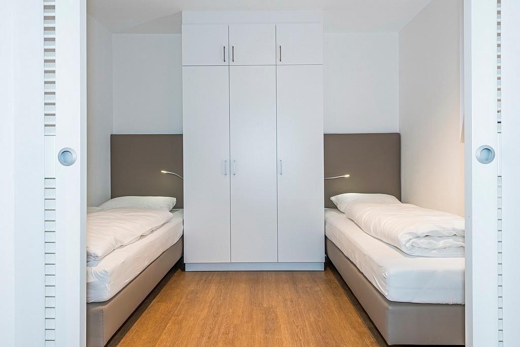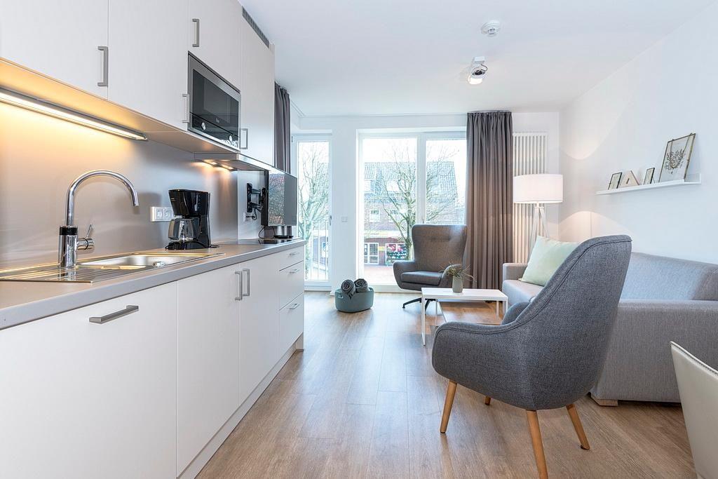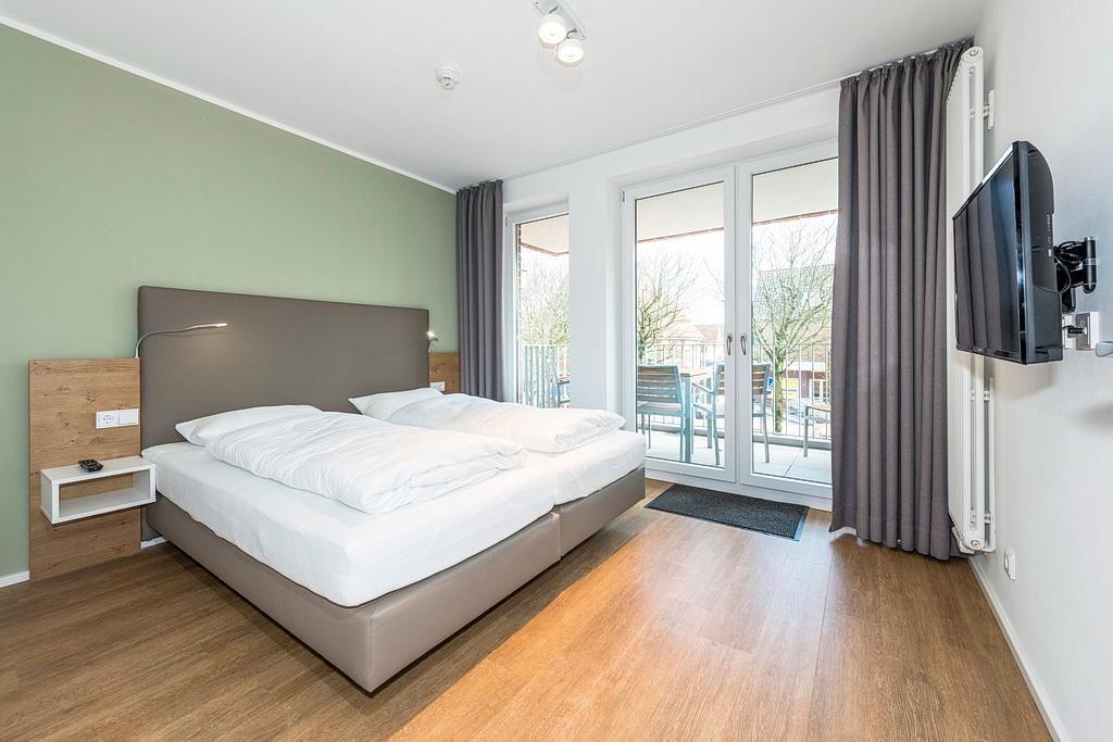 Das barrierearme Nichtraucher-Apartment verfügt über kostenfreies WLAN. Der Wohnbereich bietet eine voll ausgestattete offene Küchenzeile mit Geschirrspüler, Gefrierfach, Kaffeemaschine, Toaster, Wasserkocher und Mikrowelle mit Grillfunktion sowie einen großen Flatscreen-TV und Radio. Das Apartment verfügt über einen Esstisch und einen behaglichen Sitzbereich. Im separaten Schlafzimmer befindet sich ein Doppelbett und ein zweiter Flatscreen-TV, in einem weiteren Schlafbereich mit Schiebetür stehen Ihnen zwei Einzelbetten zur Verfügung. Ein Kinderbett kann gegen Entgelt aufgestellt werden. Im stilvollen Badezimmer befinden sich eine große begehbare Dusche, eine Badewanne sowie ein Waschtisch mit Föhn und Kosmetikspiegel. Nach einem erholsamen Urlaubstag lässt es sich auf dem sonnigen und geschützten Balkon herrlich entspannen.
