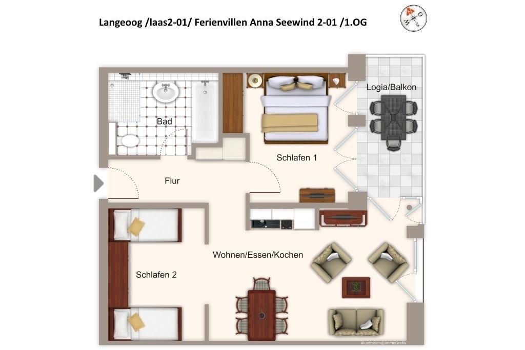 Die moderne und helle Ferienwohnung befindet sich in Süd-Lage im ersten Obergeschoss der Apartmentvilla Anna See, im Langeooger Ortszentrum, an der Barkhausenstraße gelegen. Der weitläufige Sandstrand und die Promenade sind nur 300 Meter entfernt. In der unmittelbaren Umgebung findet ihr zahlreiche Einkaufsmöglichkeiten, Restaurants und Cafés sowie Freizeitangebote wie z.B. das beliebte Meerwasser-Erlebnisbad, den Golfclub und die Kitesurfschule.