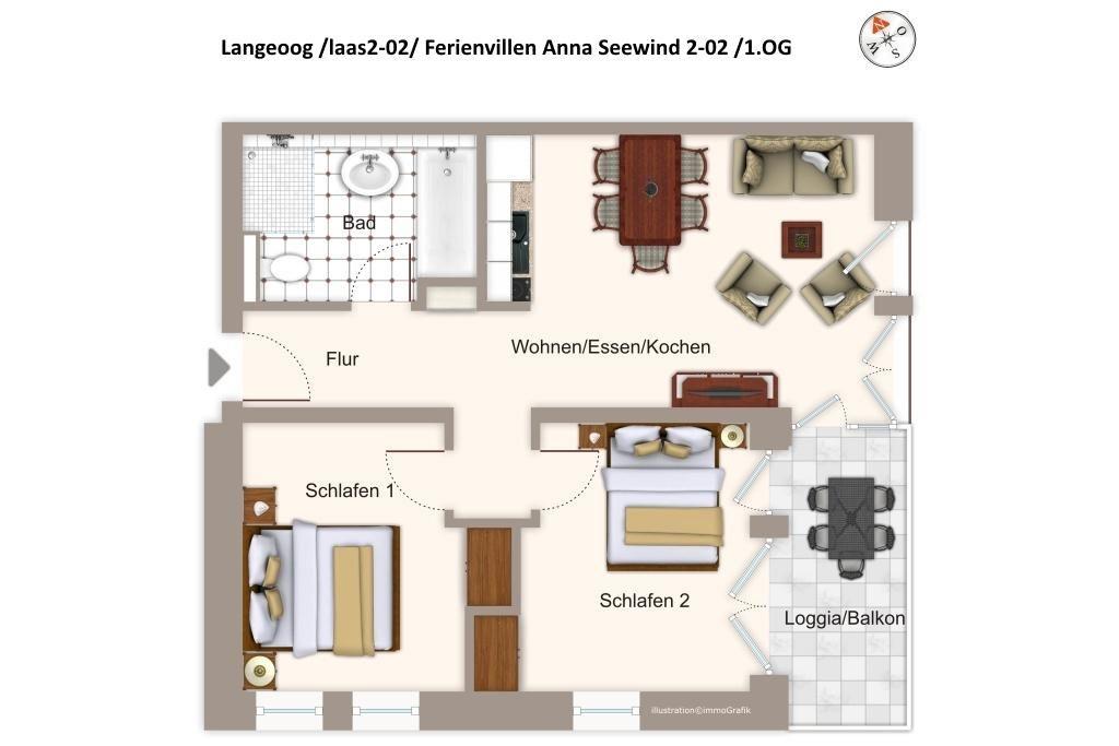 Die moderne und helle Ferienwohnung befindet sich in Süd-West-Lage im ersten Obergeschoss der Apartmentvilla Anna See, im Langeooger Ortszentrum, an der Barkhausenstraße gelegen. Der weitläufige Sandstrand und die Promenade sind nur 300 Meter entfernt. In der unmittelbaren Umgebung findet ihr zahlreiche Einkaufsmöglichkeiten, Restaurants und Cafés sowie Freizeitangebote wie z.B. das beliebte Meerwasser-Erlebnisbad, den Golfclub und die Kitesurfschule.