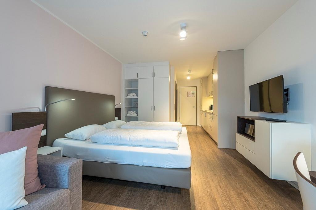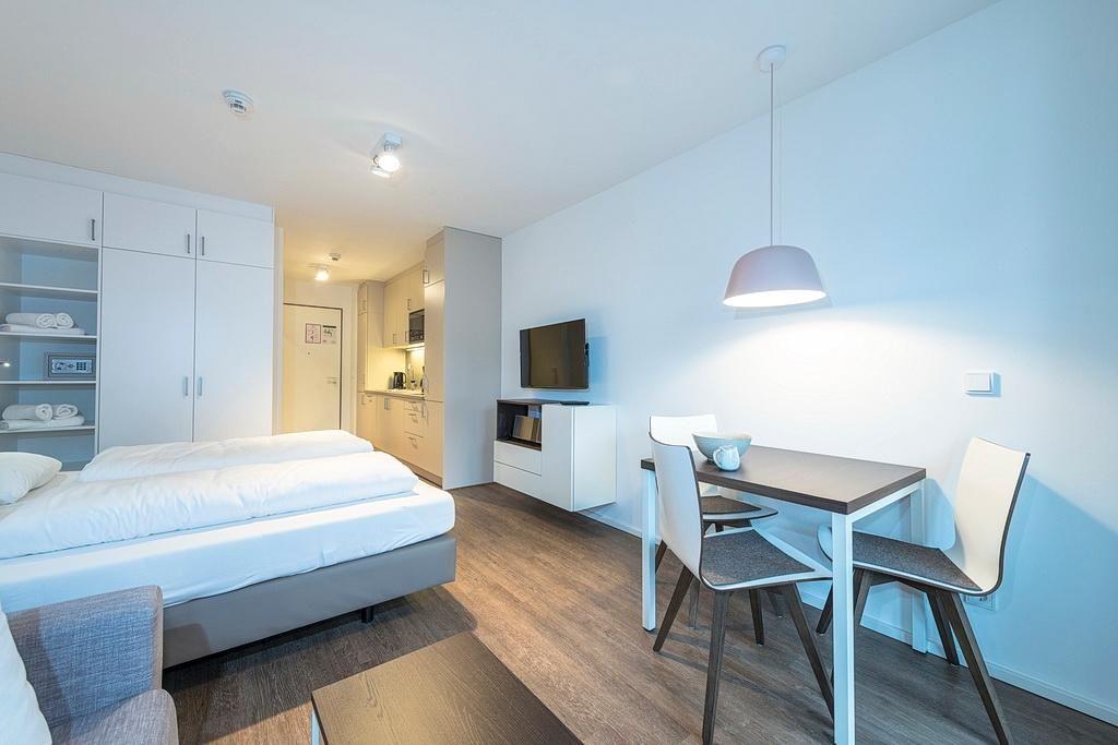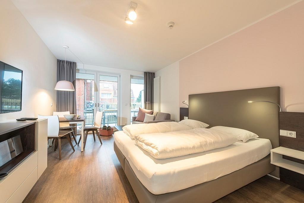 Das barrierearme Nichtraucher-Apartment verfügt über kostenfreies WLAN. Der Wohn- und Schlafraum bietet eine voll ausgestattete offene Küchenzeile mit Geschirrspüler, Kühlschrank mit Gefrierfach, Kaffeemaschine, Toaster, Wasserkocher und Mikrowelle mit Grillfunktion, eine Nespresso Kapselmaschine (DeLonghi Essenza Mini) sowie ein Doppelbett, einen großen Flatscreen-TV und ein Radio. Das Apartment verfügt über einen kleinen Esstisch und einen behaglichen Sitzbereich. Ein Kinderbett kann gegen Entgelt aufgestellt werden. Im stilvollen Badezimmer befinden sich eine große begehbare Dusche sowie ein Waschtisch mit Föhn und Kosmetikspiegel. Nach einem erholsamen Urlaubstag lässt es sich auf dem mit Gartenmöbeln ausgestatteten Balkon herrlich entspannen.
