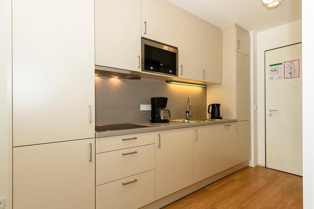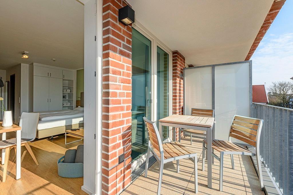 Das barrierearme Nichtraucher-Apartment verfügt über kostenfreies WLAN. Der Wohn- und Schlafraum bietet eine voll ausgestattete offene Küchenzeile mit Geschirrspüler, Gefrierfach, Kaffeemaschine, Toaster, Wasserkocher und Mikrowelle mit Grillfunktion sowie ein Doppelbett, Couch mit Schlaffunktion, einen großen Flatscreen-TV und Radio. Das Apartment verfügt über einen kleinen Esstisch und einen behaglichen Sitzbereich. Ein Kinderbett kann gegen Entgelt aufgestellt werden. Im stilvollen Badezimmer befinden sich eine große begehbare Dusche sowie ein Waschtisch mit Föhn und Kosmetikspiegel. Nach einem erholsamen Urlaubstag lässt es sich auf dem mit Gartenmöbeln ausgestatteten Balkon herrlich entspannen.