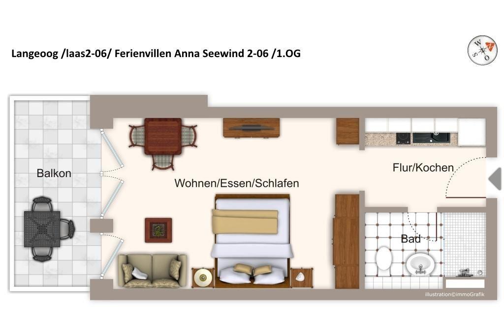 Die moderne und helle Ferienwohnung befindet sich in West-Lage im ersten Obergeschoss der Apartmentvilla Anna See, im Langeooger Ortszentrum, an der Barkhausenstraße gelegen. Der weitläufige Sandstrand und die Promenade sind nur 300 Meter entfernt. In der unmittelbaren Umgebung findet ihr zahlreiche Einkaufsmöglichkeiten, Restaurants und Cafés sowie Freizeitangebote wie z.B. das beliebte Meerwasser-Erlebnisbad, den Golfclub und die Kitesurfschule.