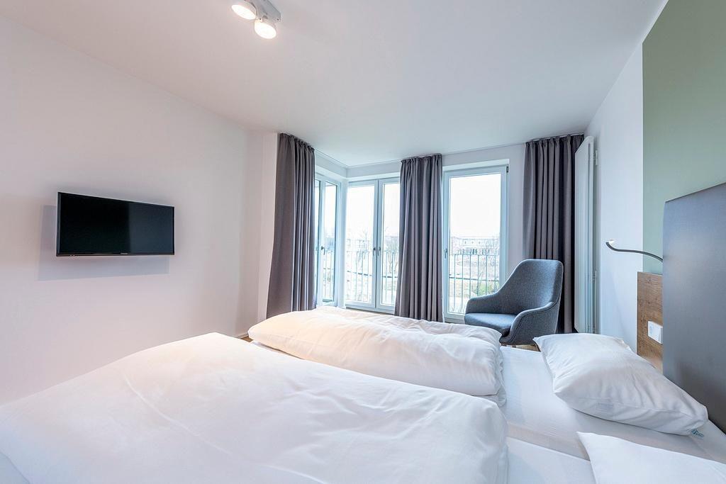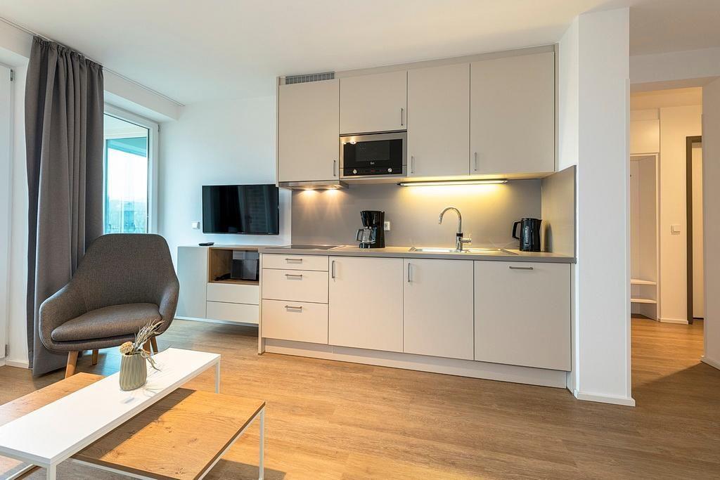 Das barrierearme Nichtraucher-Apartment verfügt über kostenfreies WLAN. Der Wohnbereich bietet eine voll ausgestattete offene Küchenzeile mit Geschirrspüler, Gefrierfach, Kaffeemaschine, Toaster, Wasserkocher und Mikrowelle mit Grillfunktion sowie einen großen Flatscreen-TV und Radio. Das Apartment verfügt über eine Schlafcouch, einen Esstisch und einen behaglichen Sitzbereich. Im separaten Schlafzimmer befindet sich ein Doppelbett und ein zweiter Flatscreen-TV, in einem weiteren Schlafbereich mit Schiebetür stehen euch zwei Einzelbetten zur Verfügung. Ein Kinderbett kann gegen Entgelt aufgestellt werden. Im stilvollen Badezimmer befinden sich eine große begehbare Dusche, eine Badewanne sowie ein Waschtisch mit Föhn und Kosmetikspiegel. Nach einem erholsamen Urlaubstag lässt es sich auf der geschützten Loggia herrlich entspannen.