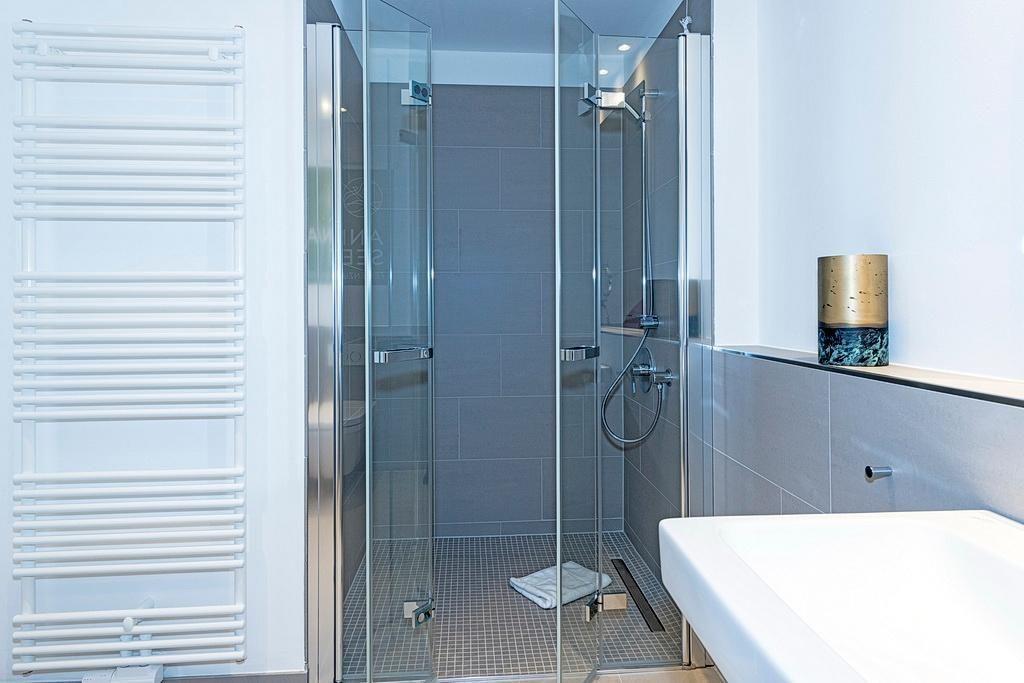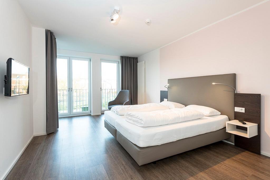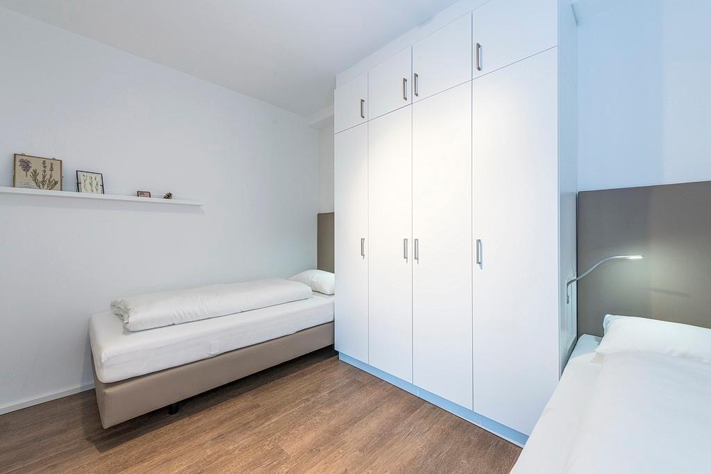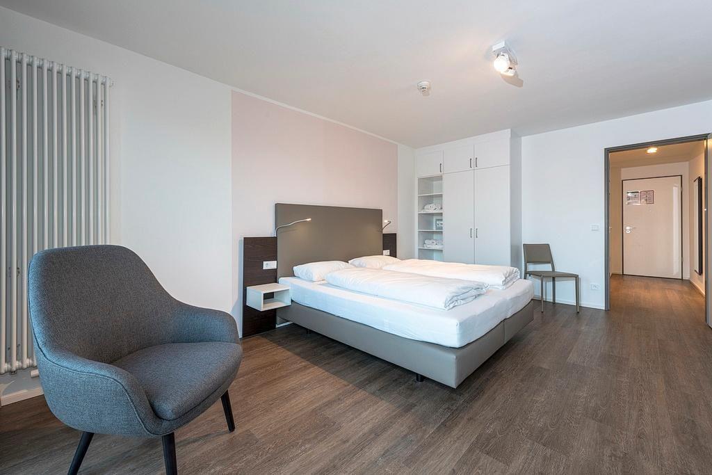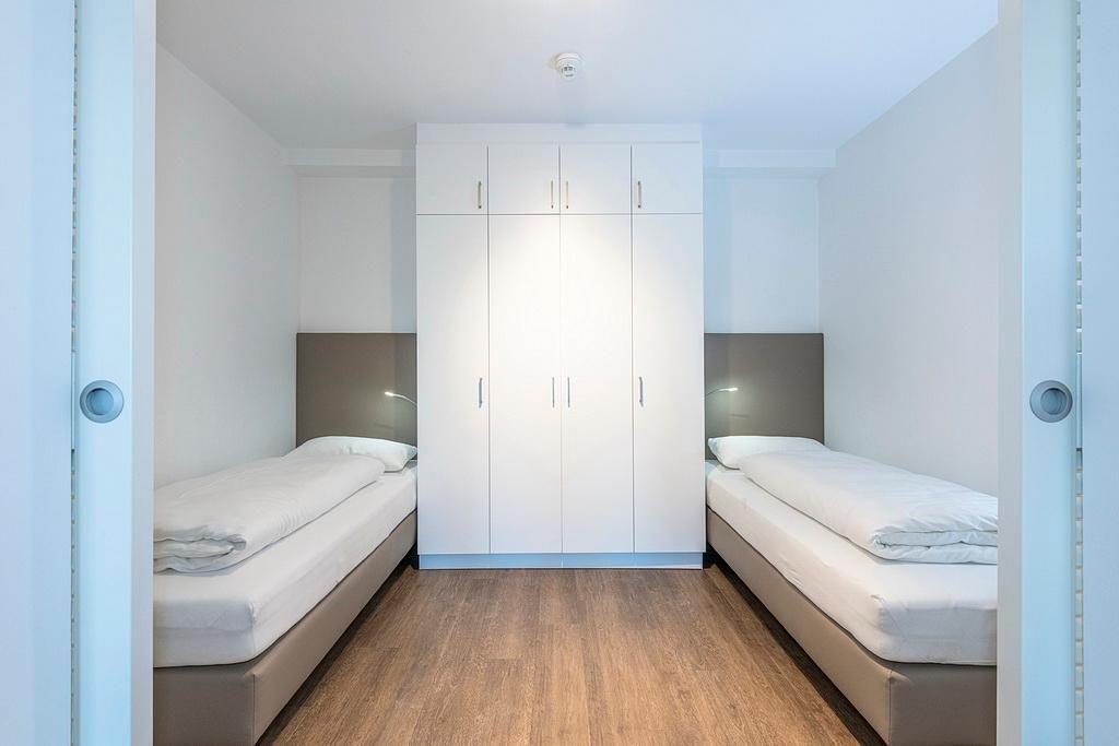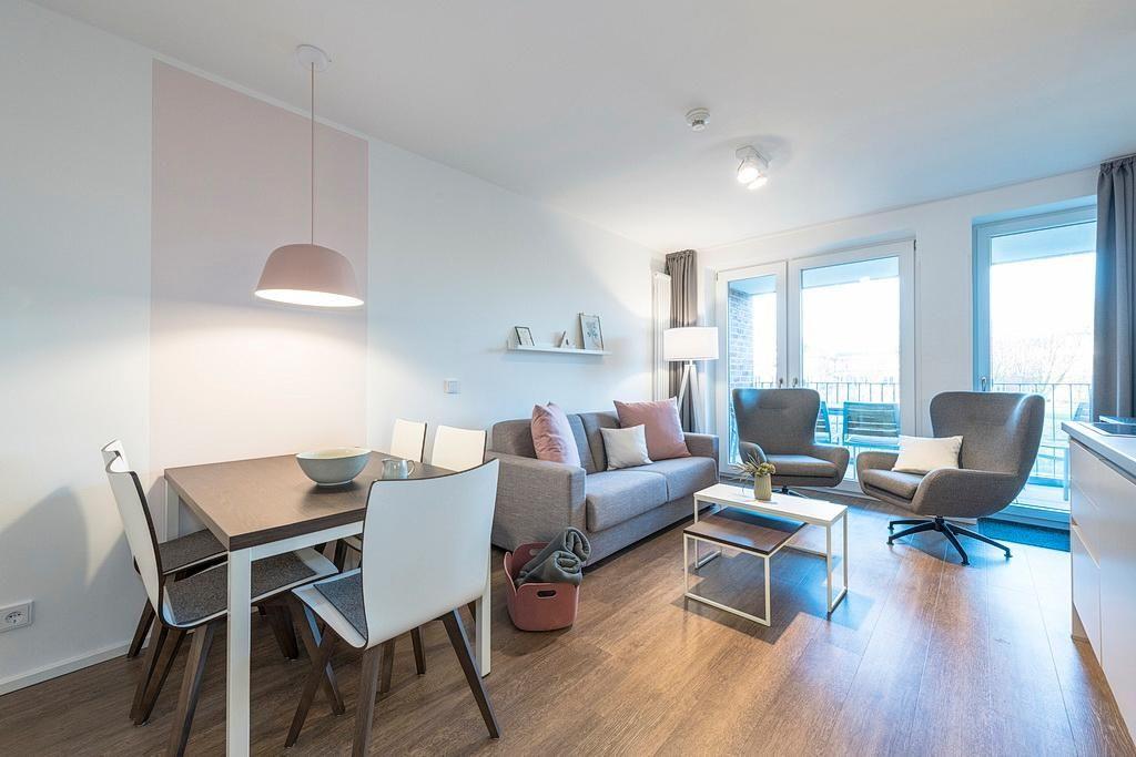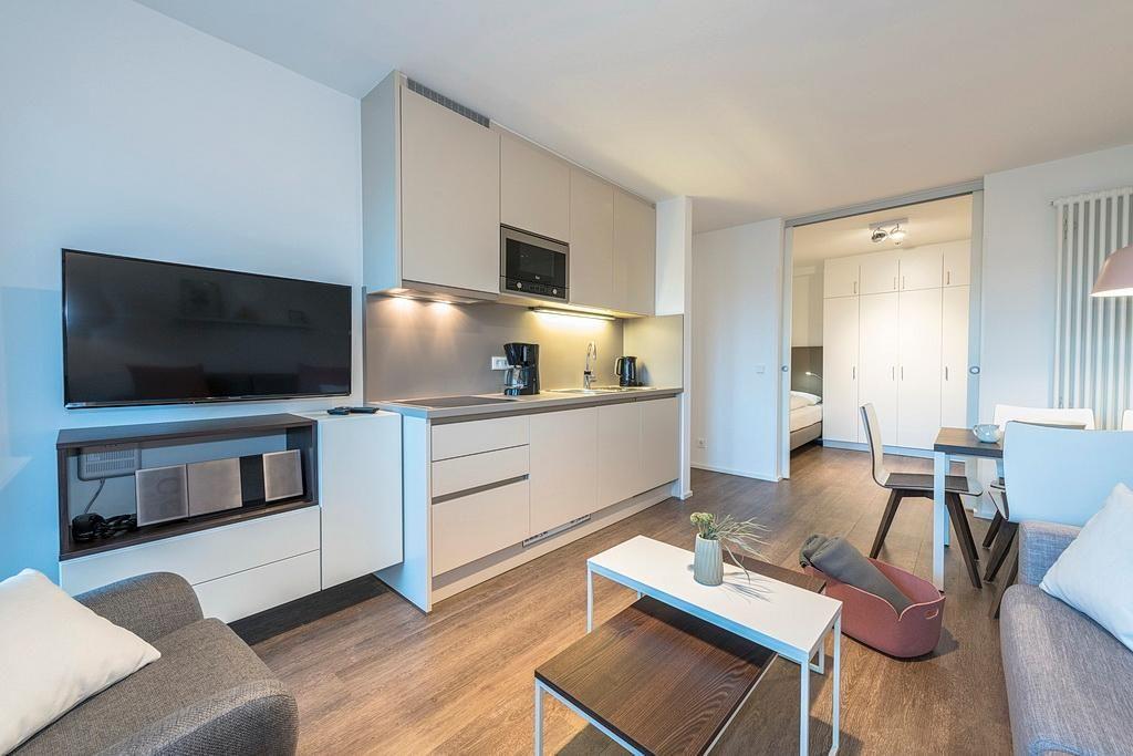 Das barrierearme Nichtraucher-Apartment verfügt über kostenfreies WLAN. Der Wohnbereich bietet, neben einer Schlafcouch, eine voll ausgestattete offene Küchenzeile mit Geschirrspüler, Gefrierfach, Kaffeemaschine, Toaster, Wasserkocher und Mikrowelle mit Grillfunktion sowie einen großen Flatscreen-TV und Radio. Das Apartment verfügt über einen Esstisch und einen behaglichen Sitzbereich. Im separaten Schlafzimmer befindet sich ein Doppelbett und ein zweiter Flatscreen-TV, in einem weiteren Schlafbereich mit Schiebetür stehen euch zwei Einzelbetten zur Verfügung. Ein Kinderbett kann gegen Entgelt aufgestellt werden. Im stilvollen Badezimmer befinden sich eine große begehbare Dusche sowie ein Waschtisch mit Föhn und Kosmetikspiegel. Nach einem erholsamen Urlaubstag lässt es sich auf der geschützten Loggia herrlich entspannen.