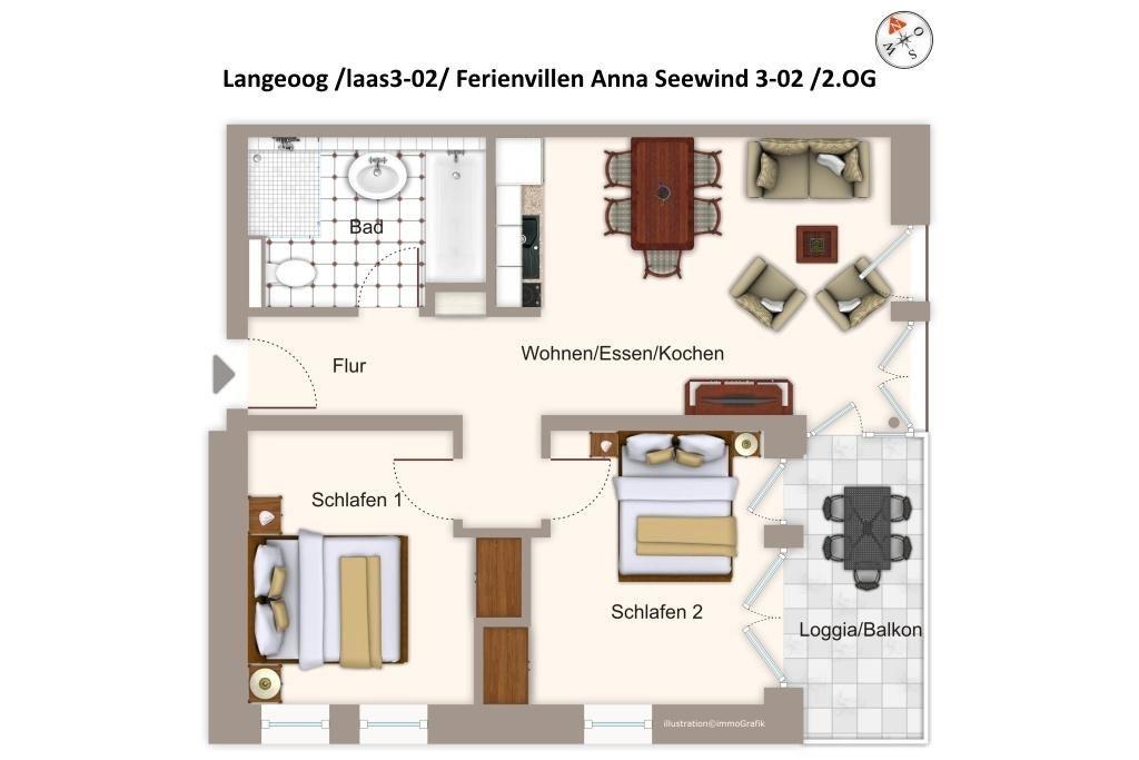 Die moderne und helle Ferienwohnung befindet sich in Süd-West-Lage im zweiten Obergeschoss der Apartmentvilla Anna See, im Langeooger Ortszentrum, an der Barkhausenstraße gelegen. Der weitläufige Sandstrand und die Promenade sind nur 300 Meter entfernt. In der unmittelbaren Umgebung findet ihr zahlreiche Einkaufsmöglichkeiten, Restaurants und Cafés sowie Freizeitangebote wie z.B. das beliebte Meerwasser-Erlebnisbad, den Golfclub und die Kitesurfschule.