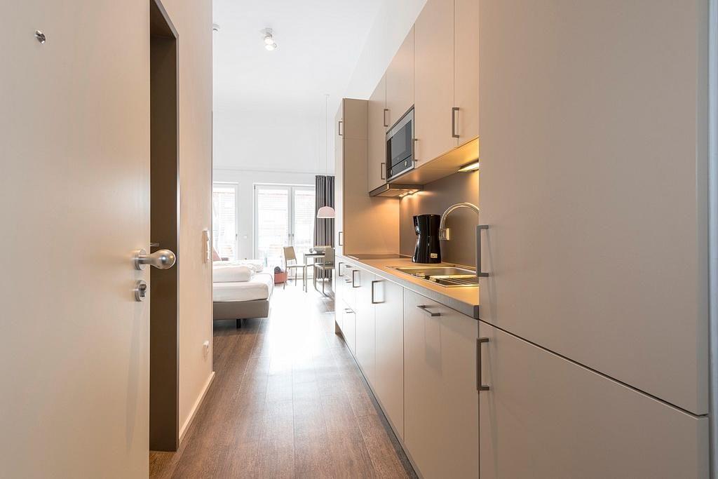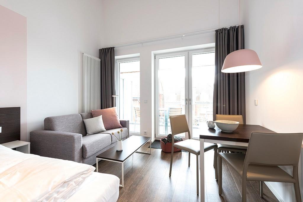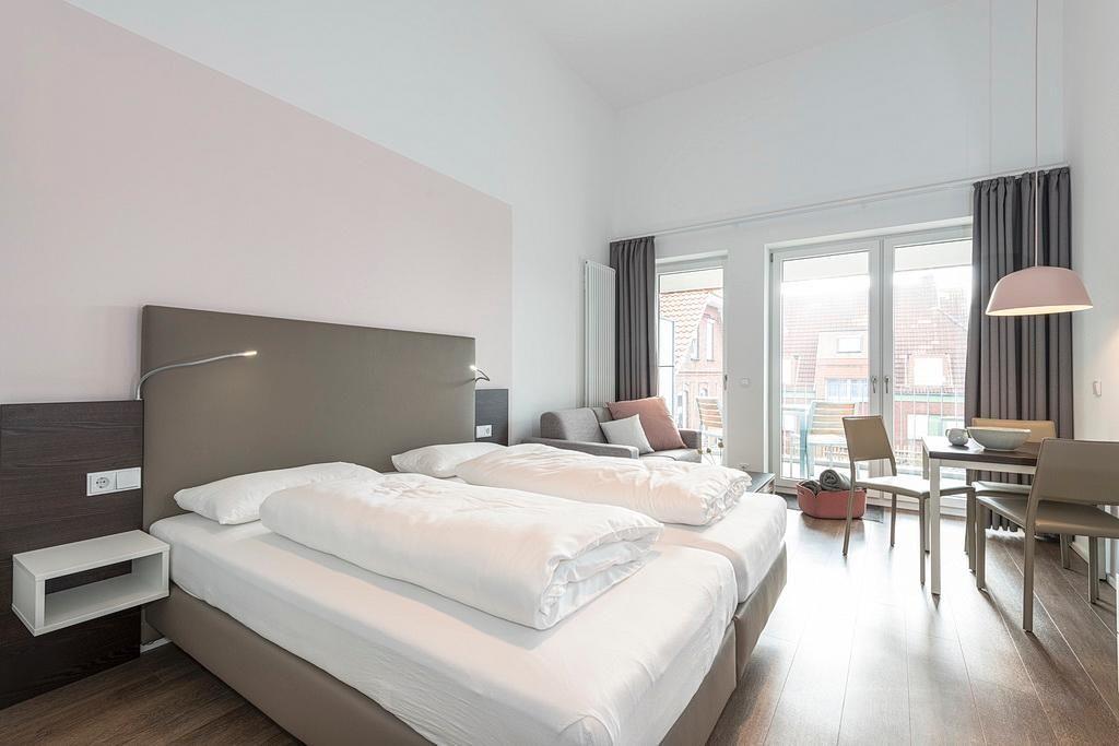 Das barrierearme Nichtraucher-Apartment verfügt über kostenfreies WLAN. Der Wohn- und Schlafraum bietet eine voll ausgestattete offene Küchenzeile mit Geschirrspüler, Gefrierfach, Kaffeemaschine, Toaster, Wasserkocher und Mikrowelle mit Grillfunktion sowie ein Doppelbett, Couch mit Schlaffunktion, einen großen Flatscreen-TV und Radio. Das Apartment verfügt über einen kleinen Esstisch und einen behaglichen Sitzbereich. Ein Kinderbett kann gegen Entgelt aufgestellt werden. Im stilvollen Badezimmer befinden sich eine große begehbare Dusche sowie ein Waschtisch mit Föhn und Kosmetikspiegel. Nach einem erholsamen Urlaubstag lässt es sich auf dem mit Gartenmöbeln ausgestatteten Balkon herrlich entspannen.