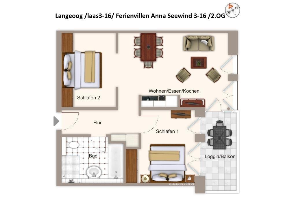 Die moderne und helle Ferienwohnung befindet sich in Süd-Ost-Lage im zweiten Obergeschoss der Apartmentvilla Anna See, im Langeooger Ortszentrum, an der Barkhausenstraße gelegen. Der weitläufige Sandstrand und die Promenade sind nur 300 Meter entfernt. In der unmittelbaren Umgebung findet ihr zahlreiche Einkaufsmöglichkeiten, Restaurants und Cafés. Freizeitangebote wie z. B. das beliebte Meerwasser-Erlebnisbad, der Golfclub oder die Kitesurfschule sind fußläufig bequem zu erreichen.