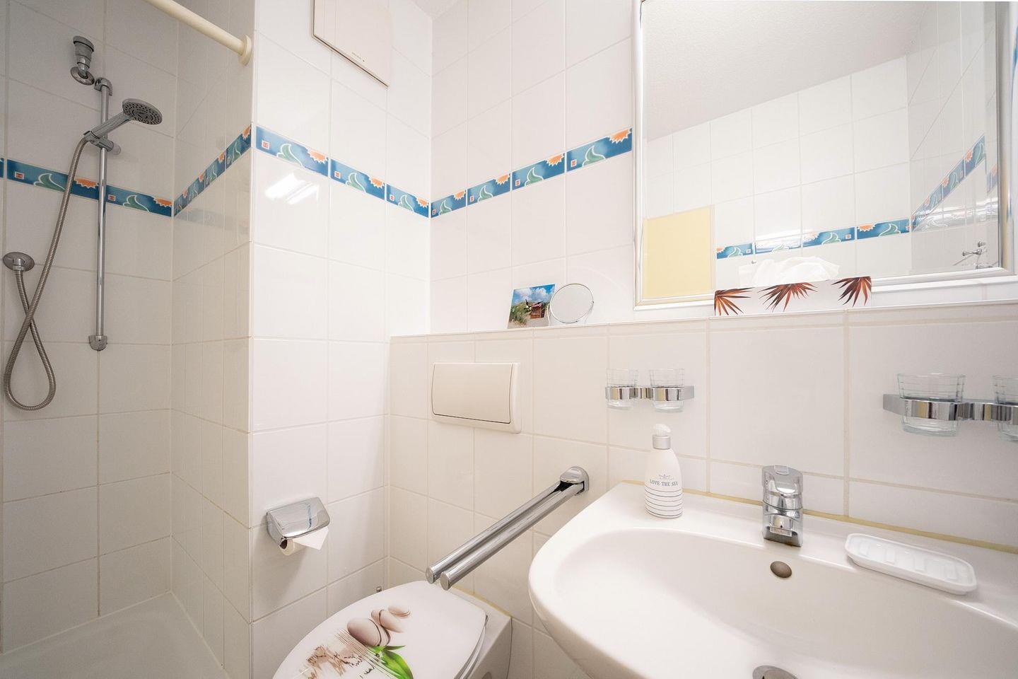 Die angrenzende abgetrennte Küche bietet Mikrowelle, Backofen, Kaffeefilter- und Kaffeepadmaschine, Toaster, Handstaubsauer, Mixer, Eier- und Wasserkocher und einen Kühlschrank mit Gefrierfach. Überdies verfügt das Apartment über Bügeleisen/-brett und Wäscheständer. Im Badezimmer mit WC und Dusche befindet sich ein Waschbecken mit Kindertritt sowie ein Föhn. Nach einem erlebnisreichen Urlaubstag lässt es sich auf dem mit Gartenmöbeln für vier Personen und Sonnenschirm ausgestatteten Balkon entspannen. Der Balkon ist vom Wohn-/ Essbereich zugänglich.