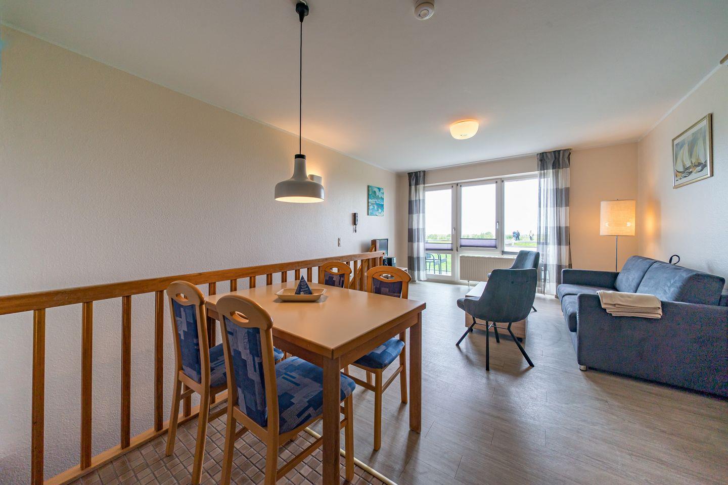 Die Maisonette-Wohnung erstreckt sich über die 1. und 2. Etage der Ferienanlage und befindet sich auf Stelzen, über den Parkplätzen. Eure Umgebung bietet das Beste aus beiden Welten: kleine Läden, Cafés und Restaurants zum Genießen – und dazu Erholung im Thalasso Meeres Spa in Horumersiel oder Spaß am Wasserskilift Hooksiel.