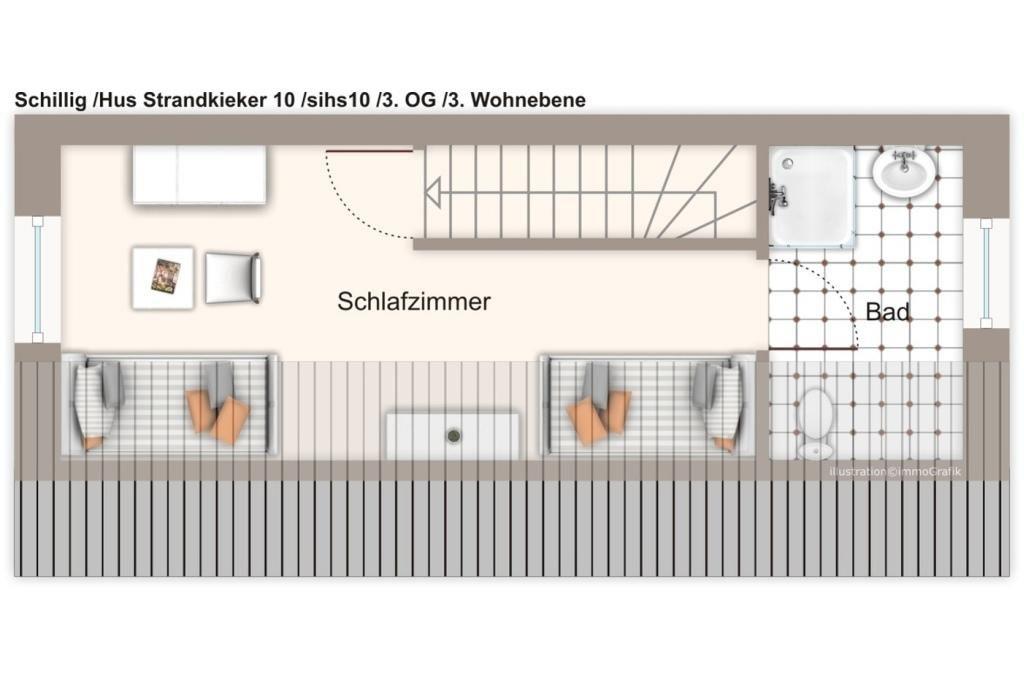 Das Apartment verfügt über kostenfreies WLAN. Die drei Ebenen des Feriendomizils ergeben sich aus einem Schlafbereich mit Doppelbett, Badezimmer mit Regendusche und Abstellraum im ersten Obergeschoss sowie dem Wohnbereich mit offener Küche und Balkon mit Nordsee-Blick in der zweiten Etage. Auf der dritten Wohnebene befinden sich das zweite Schlafzimmer mit zwei Einzelbetten und ein weiteres Badezimmer mit Regendusche.