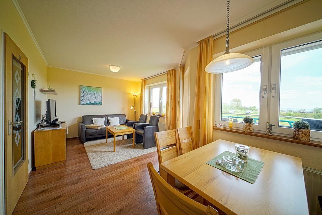 Zur Konzeption der Maisonette-Wohnung die über 2 Etagen geht gehören ein Schlafzimmer mit Doppelbett und TV, zwei Einzelbetten, ein Wohnzimmer und ein Balkon mit malerischem Meerblick auf Schillig.