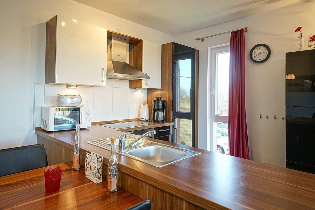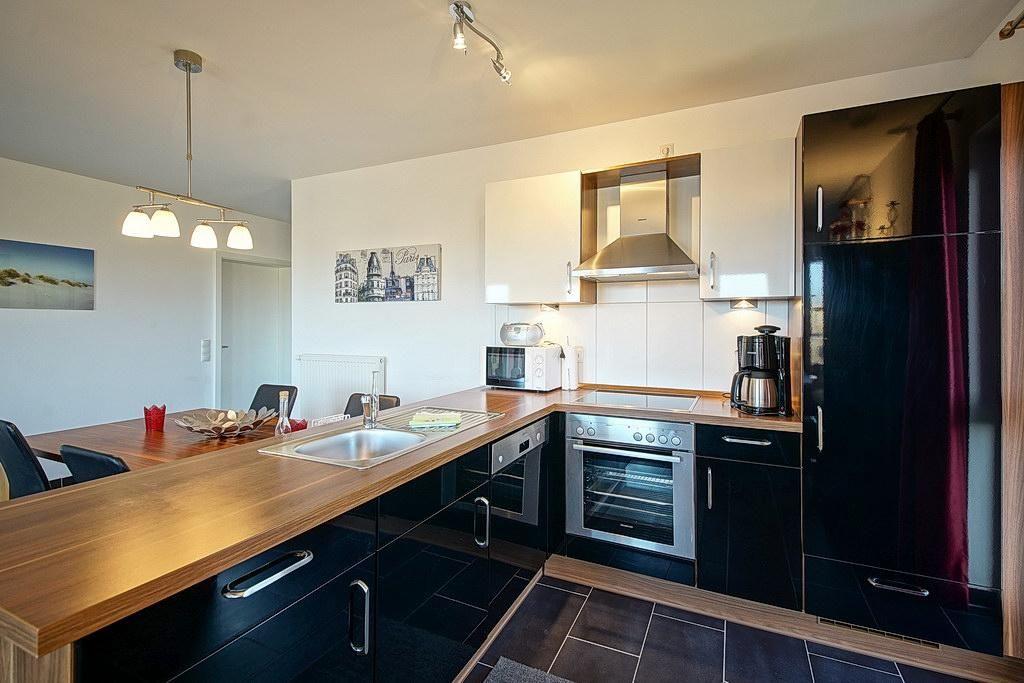 Eine voll ausgestattete offene Küche mit Backofen, Geschirrspüler und Tiefkühlfach, Wasserkocher, Kaffeemaschine und Toaster und eine TV-HiFi-Anlage ergänzen die gehobene Ausstattung dieser Ferienunterkunft.