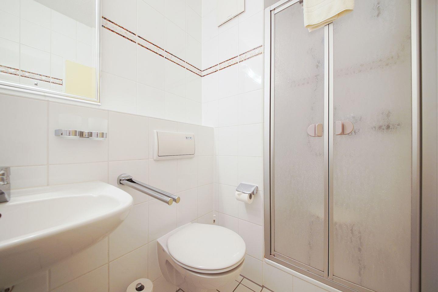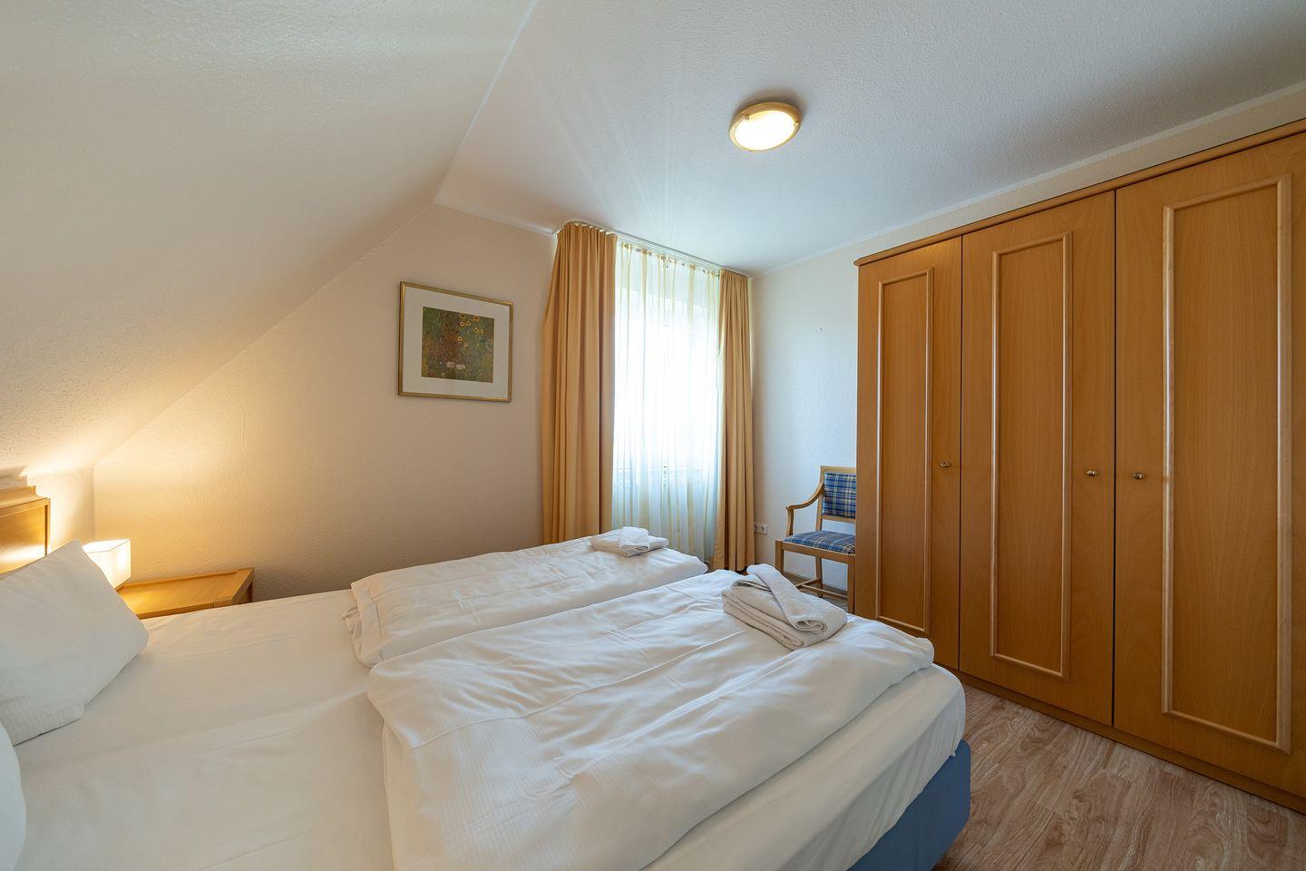 Die zwei Ebenen der Ferienwohnung ergeben sich aus separater Küche, Wohnbereich mit Laminat und Doppelschlafcouch und Balkon mit seitlichem Meerblick auf der einen und durch zwei Schlafzimmer mit Doppelbett bzw. zwei Einzelbetten und Bad mit Dusche auf der anderen und höheren Etage.