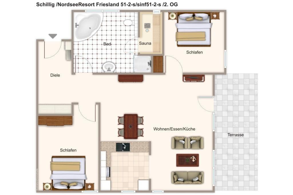 Das „NordseeResort Friesland“ in Schillig verfügt über hochwertige Apartments in direkter Deichlage. Die 3-Zimmer-Ferienwohnung mit 79 qm und einladendem Balkon bietet Platz für bis zu 4 Personen und besitzt eine eigene Sauna.