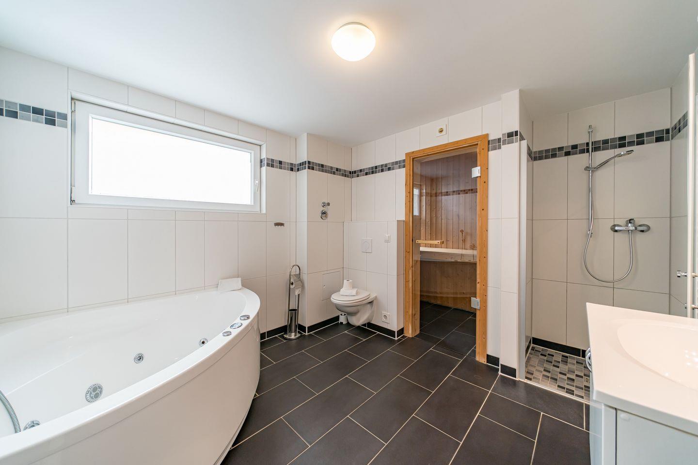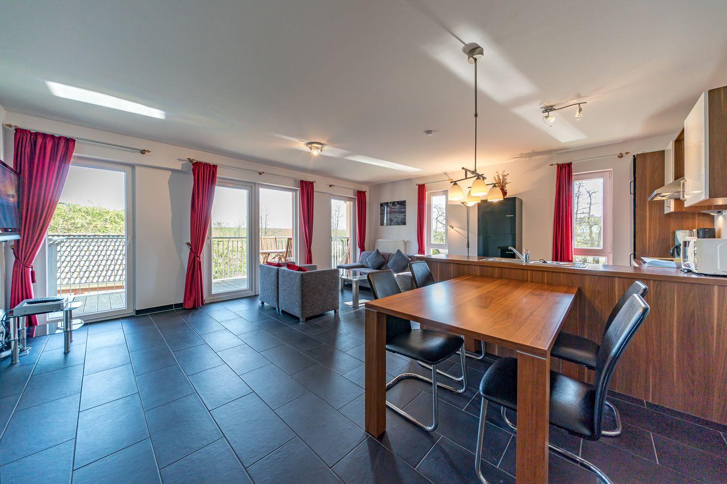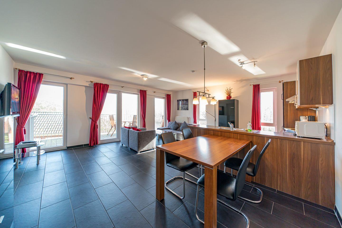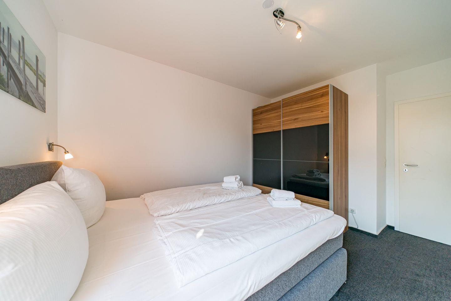 Zum Apartment gehören zwei Schlafzimmer mit jeweils einem Doppelboxspringbett (1,60 x 2,00 m und 1,80 x 2,00 m), ein Wohnbereich, ein hochwertiges Bad mit Dusche, Whirlbadewanne, Sauna und Fußbodenheizung und ein Balkon mit Gartenmöbeln und Sonnenschirm.