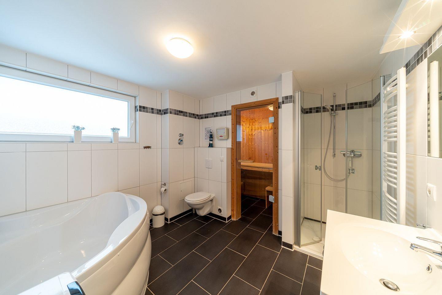 Ein stilvolles und besonders hochwertiges Badezimmer mit Tageslicht und Fußbodenheizung, Badewanne, begehbarer Dusche, WC, Waschtisch, Kosmetikspiegel, Föhn und Handtuchwärmer steht euch zur Verfügung. Ein echtes Highlight ist hier die eigene Sauna!