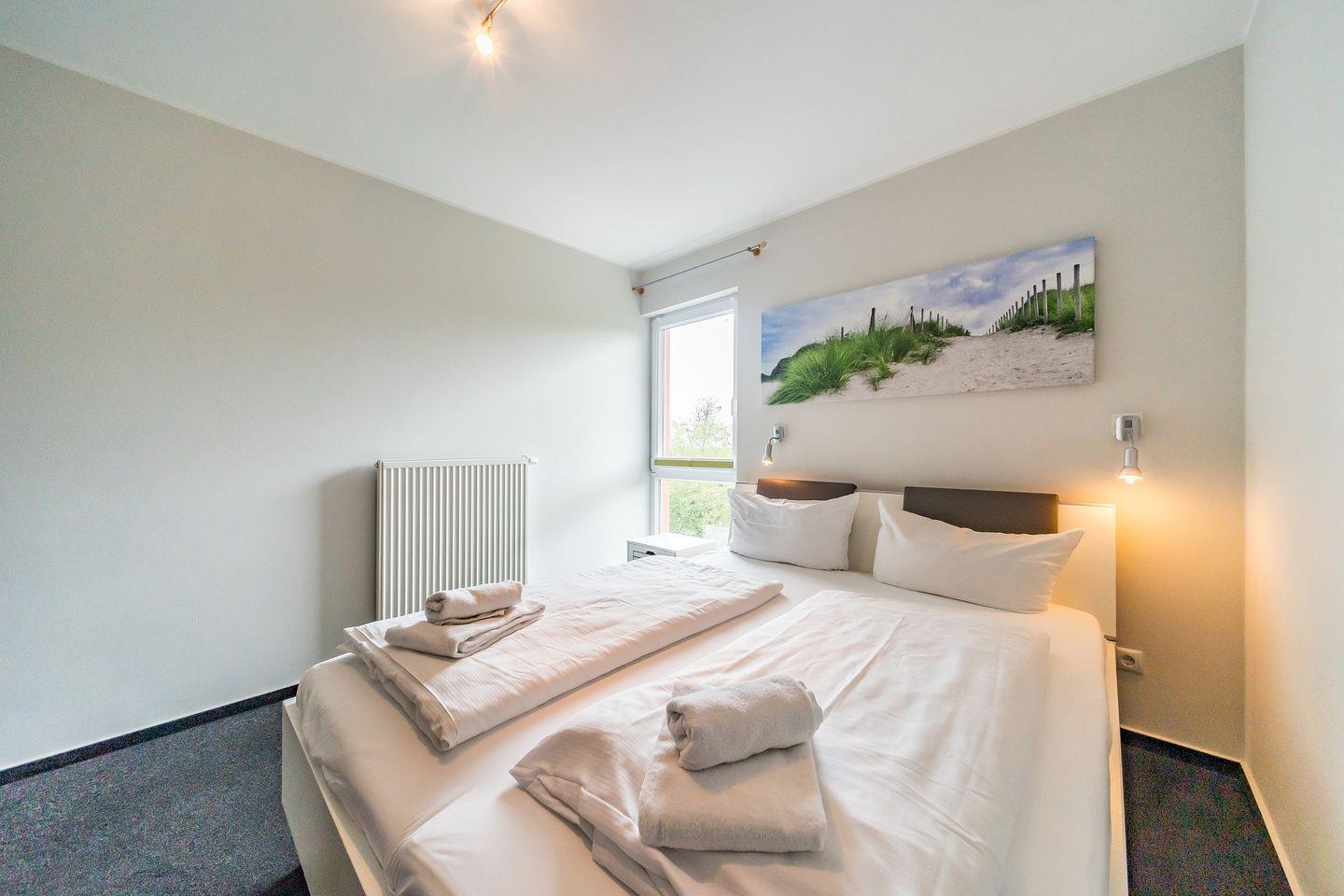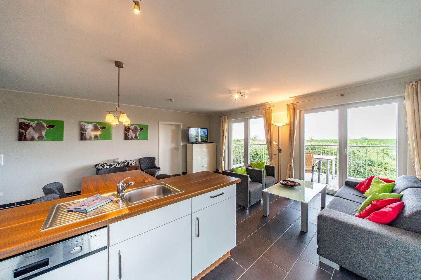 Das 79 qm große 3-Zimmer-Ferienapartment ist für 4 Personen geeignet. Besonders hervorzuheben ist der schöne Balkon, direkt am Wasserlauf gelegen und mit Blick bis zur Nordsee und zum Deich. Das Apartment verfügt über eine eigene Sauna und Badewanne.