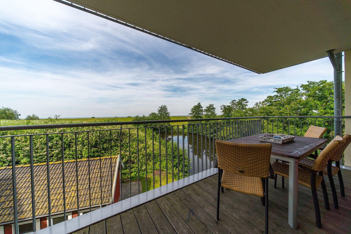 Bereits beim Frühstück könnt ihr auf dem großzügigen und nordöstlich gelegenen Balkon die idyllische Lage am Wasser genießen. Der überdachte Balkon ist vom Wohnbereich aus begehbar und bietet euch einen wundervollen Blick zum Meer und dem vorgelagerten Deich.