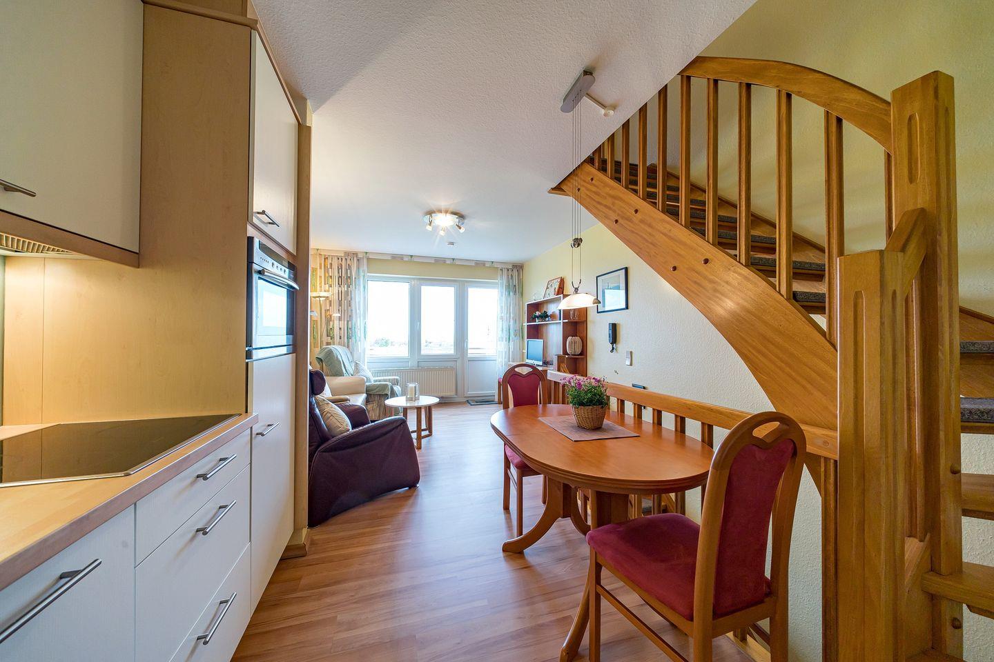 Die 75 m² große 3-Zimmer-Maisonette-Ferienwohnung ist für bis zu 4 Personen geeignet. Besonders hervorzuheben sind die strandnahe Lage und der Blick auf das Meer und den Deich aus dem Wohnzimmer und vom Balkon der familienfreundlichen Wohnung.