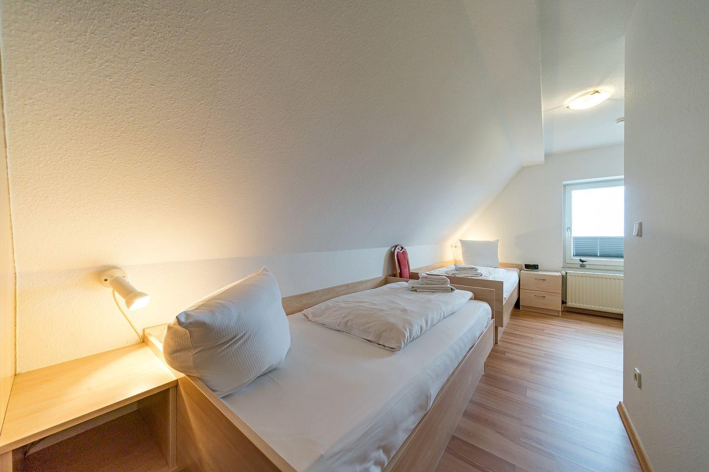 Das zweite Schlafzimmer befindet sich auf der dritten Wohnebene und verfügt über zwei Einzelbetten. Auf dieser Etage liegt auch das zweite Badezimmer. Beide Badezimmer verfügen über WC, Waschbecken, Föhn und Kosmetikspiegel. Das Apartment verfügt über kostenfreies WLAN.