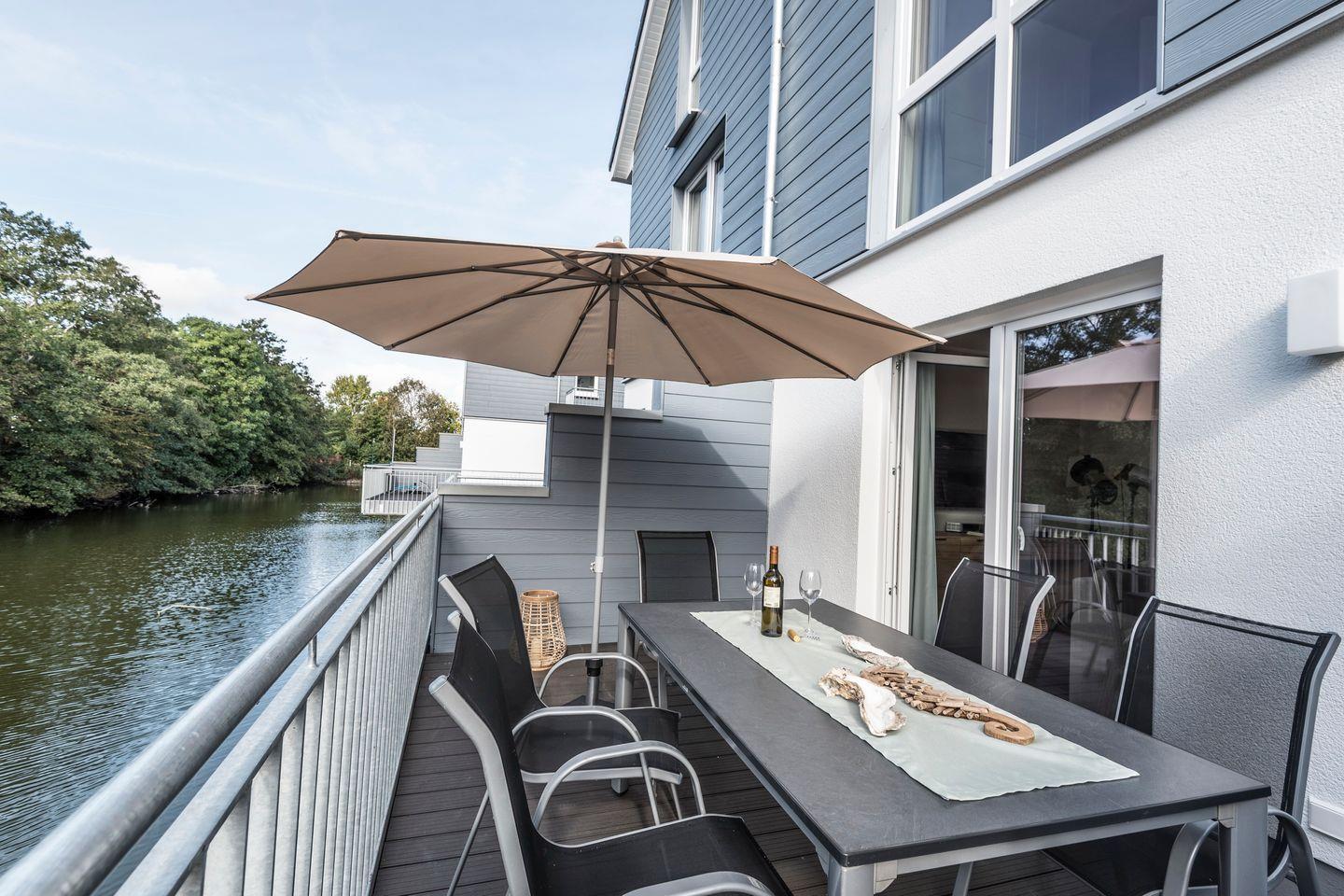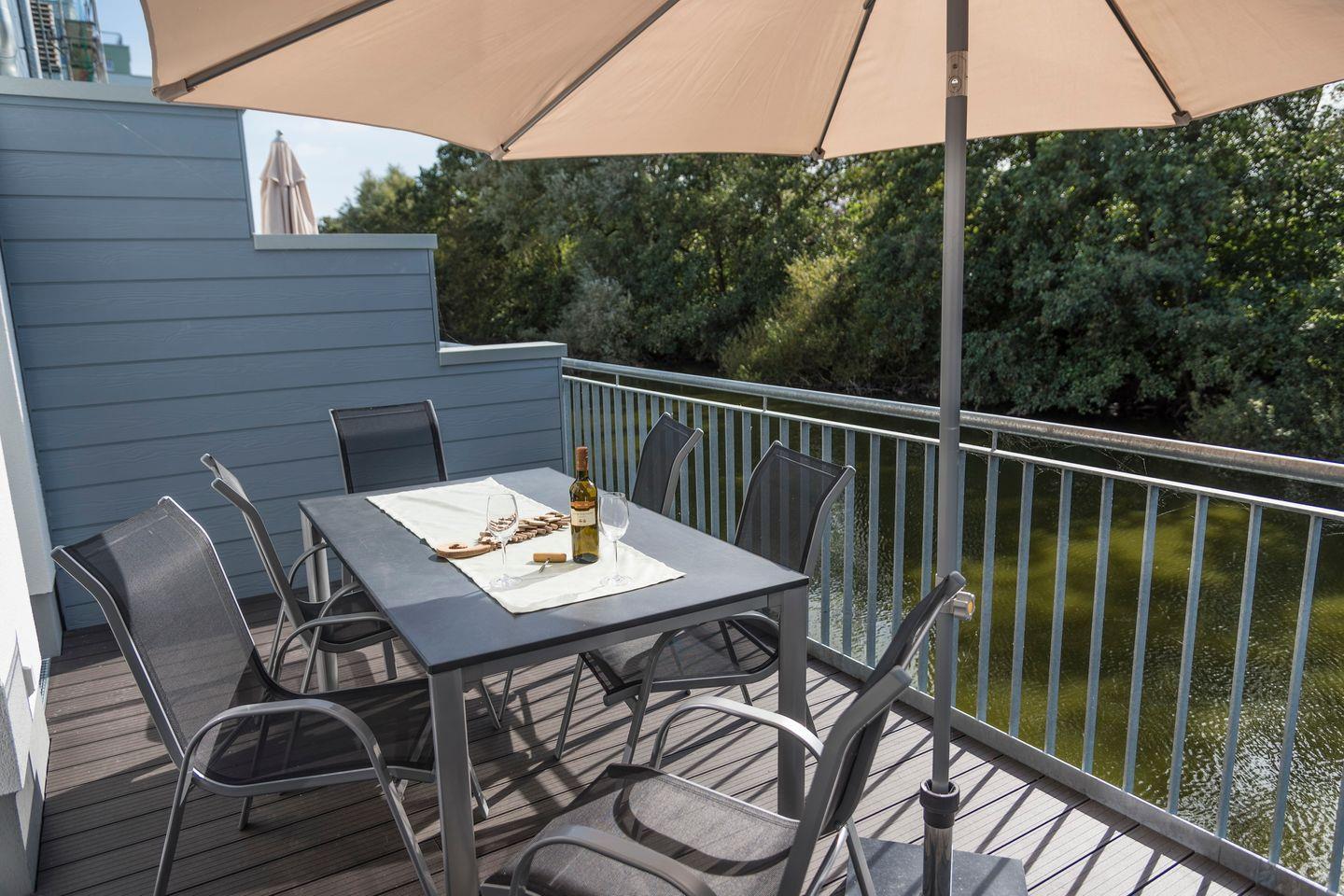 Bereits beim Frühstück könnt ihr auf der großzügigen und südlich gelegenen Terrasse die idyllische Lage am Wasser und den Blick ins Grüne genießen. Der Terrasse ist vom Wohnbereich aus begehbar. Ein überdachter Balkon zur Meerseite mit Blick auf den vorgelagerten Deich verspricht Nordseefeeling pur. Der Balkon befindet sich im Dachgeschoss und ist von einem weiteren Wohnbereich auf der Galerie aus begehbar.